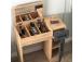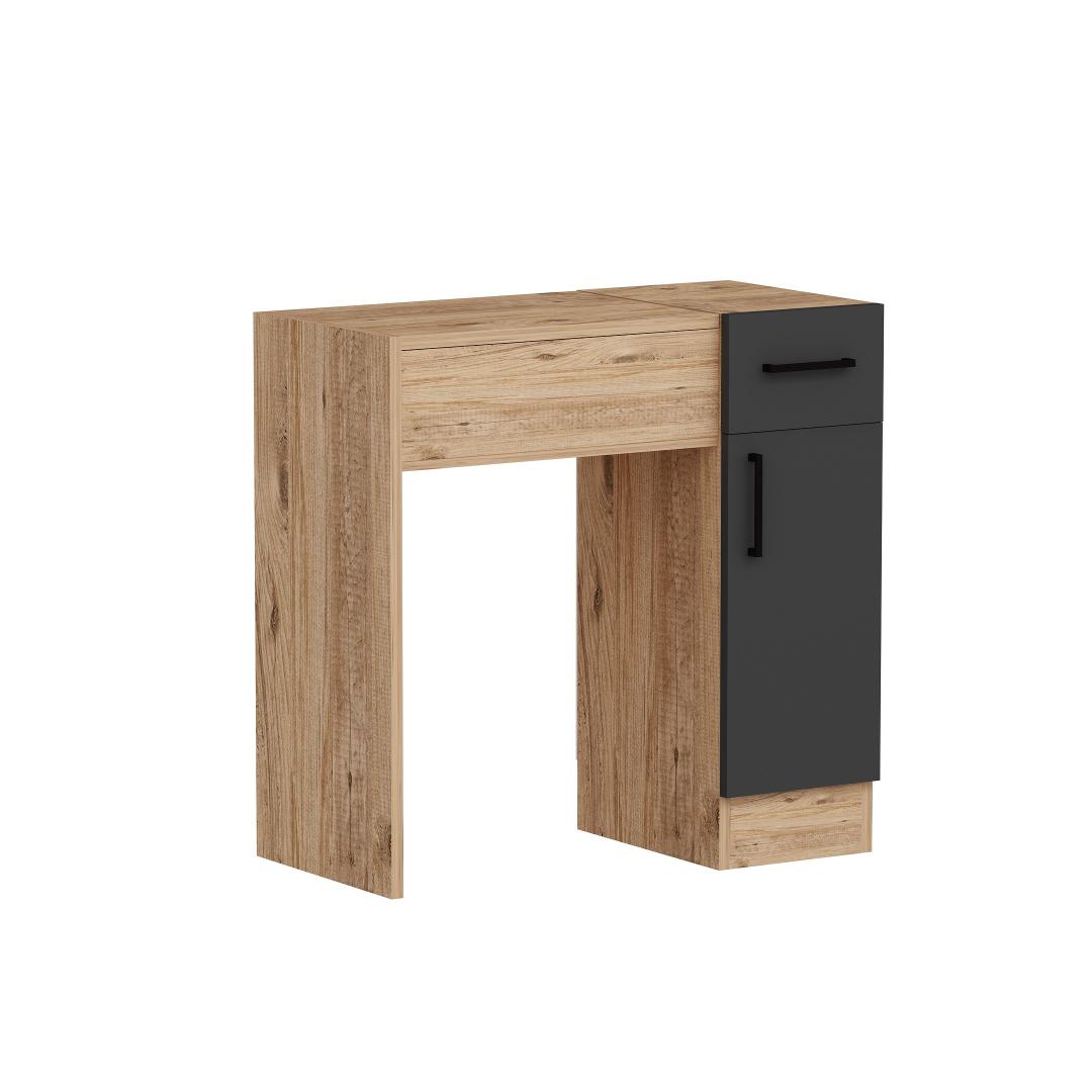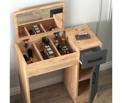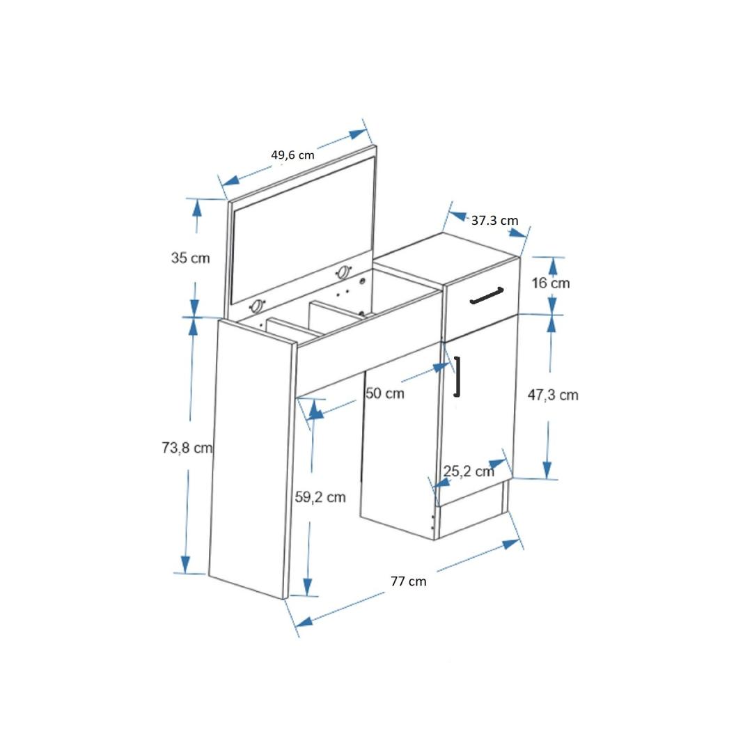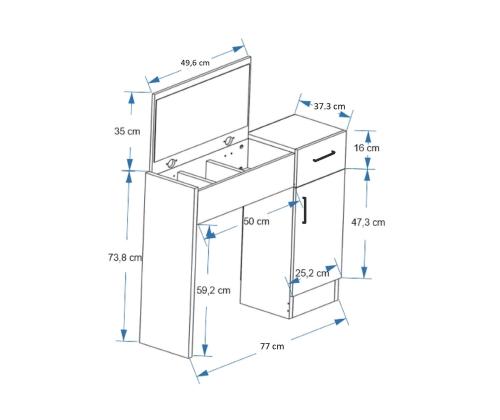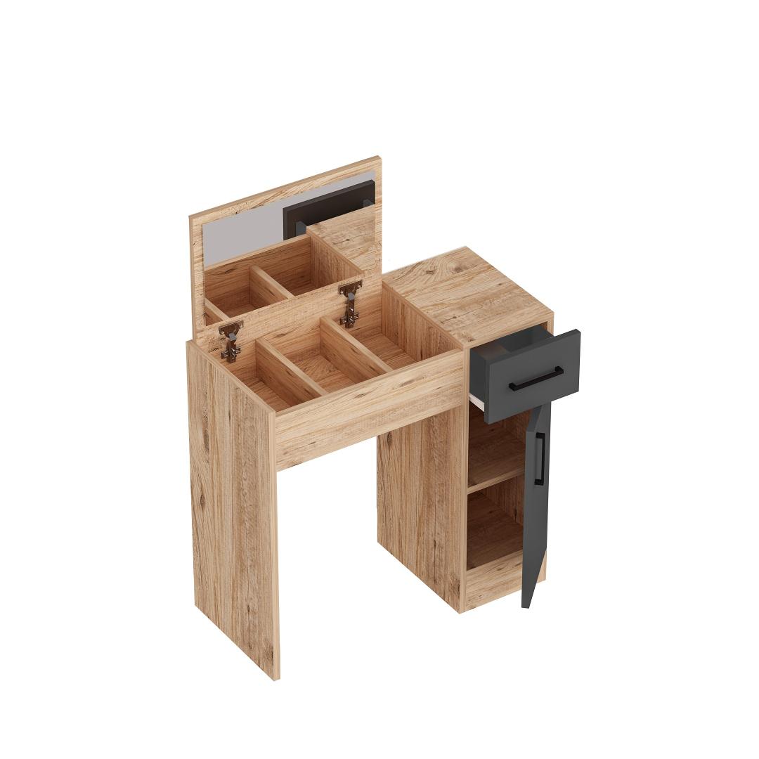 Muuda oma hommikurutiin meie kauni meigilaudaga, mis on loodud armastuse ja detailidele tähelepanu pööramisega. Sujuv disain ja elegantne värvikombinatsioon Atlandi mändi ja antratsiidi toovad sinu magamistuppa või riietusruumi natuke rafineeritust.Paranda oma ilu rituaaliKujuta ette, et istud sellel kaunil meigilaud, ümbritsetud kõigist oma lemmik ilu toodetest. Avardunud laudpind pakub piisavalt ruumi sinu kosmeetikatoodetele, pintslitele ja aksessuaaridele, muutes igapäevase ideaalse välimuse loomise lihtsaks.Korralda oma ruumÜtle hüvasti segastele tööpindadele ja kaootilistele sahtlitele. Meie meigilaud on varustatud piisava hoiuruumiga sahtlite ja riiulitega, võimaldades sul hoida kõik korralikult organiseeritud ja käeulatuses. Hoia end organiseerituna ja säästa aega hommikul valmides.Kvaliteetne käsitööValmistatud 100% melamiinkattega puitlaastplaadist, on see meigilaud loodud kestma. 18mm paksus tagab vastupidavuse ja stabiilsuse, nii et saad nautida oma uut vanityt aastaid.Tehnilised andmed:Materjal: 100% melamiinkattega puitlaastplaatPaksus: 18mmLaius: 77cmKõrgus: 108.8cmSügavus: 37.3cmVärv: Atlandi mänd ja antratsiitUuenda oma ilu rutiini ja lisa oma ruumile luksuse puudutus meie meigilaudaga. Tellige oma täna ja kogege, millist erinevust see teie igapäevases rutiinis võib teha. Värv: Atlantic Pine Anthracite