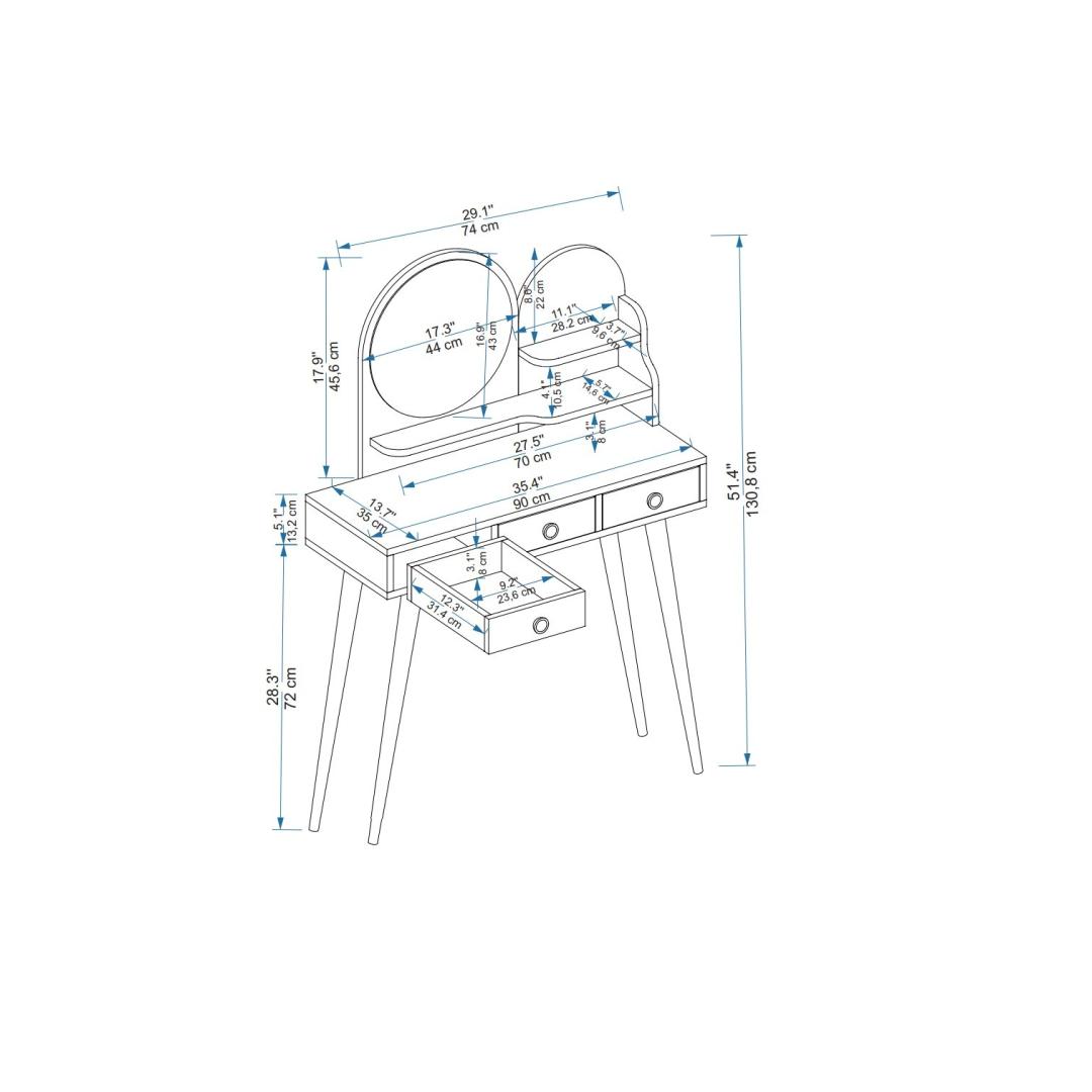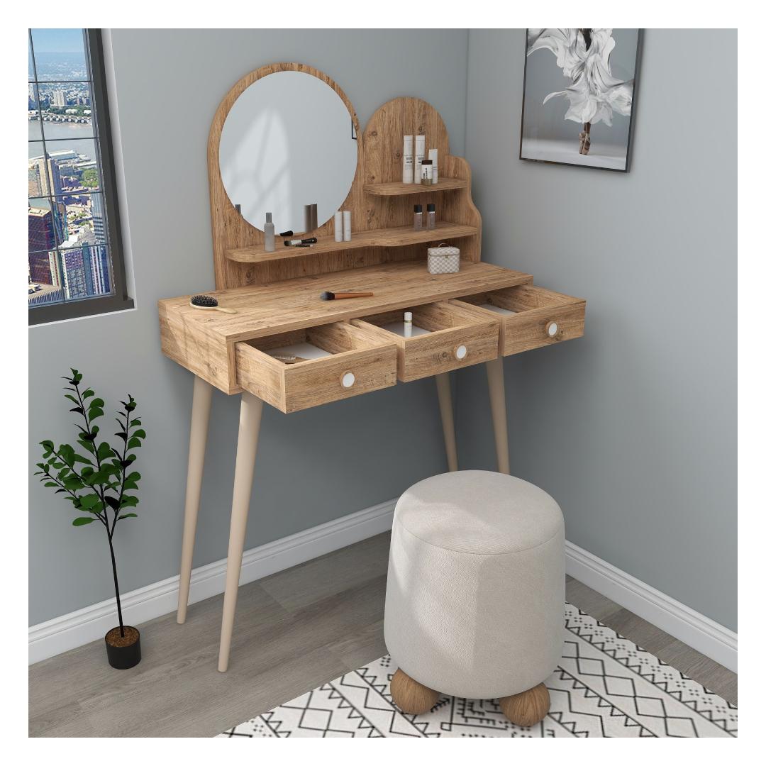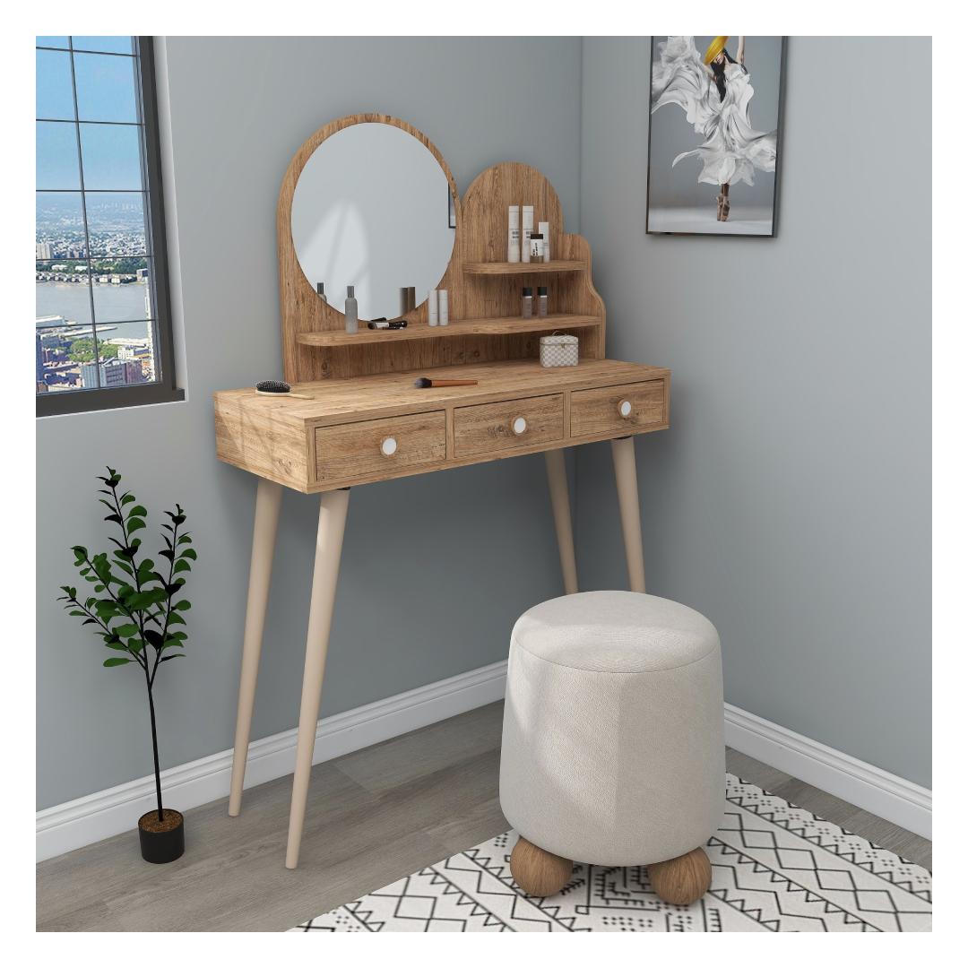 Transformeeri oma hommikune rutiin suurepärase meigilaua abilHellitage end luksuslikult kaunilt kujundatud meigilauaga, mis tõstab teie hommikuse rutiini uuele tasemele. See vapustav mööblitükk ei ole mitte ainult praktiline lisa teie magamistoas, vaid elegantsi ja elegantsuse avaldus. Vajuta end kvaliteetse käsitöögaSee äärmiselt hoolikalt ja detailidele tähelepanu pöörates valmistatud meigilaud on valmistatud 100% melamiiniga kaetud puitlaastplaadist, mis tagab vastupidavuse ja pikaealisuse. 18 mm paksus lisab tugevust, pakkudes stabiilset pinda kõigile teie ilutarvikutele. Välistage oma ilurituaali peegligaSelle meigilaua juurde kuulub peegel, millest saab teie usaldusväärne kaaslane teie ilurituaalide ajal. Selle elegantne disain ja täiuslik suurus võimaldavad hõlpsasti reguleerida, tagades, et saate iga kord saavutada ideaalse nurga veatu pealekandmiseks. Kaunistage loodust pöögipuust jalgadegaMeigilaua toetavad elegantsed pöögipuust jalad, mis lisavad teie ruumile loodusliku ilu. Need jalad ei taga mitte ainult stabiilsust, vaid suurendavad ka laua üldist esteetilist atraktiivsust, muutes selle teie ruumi tõeliseks keskpunktiks. Sukelduge atlantilise männi soojusesseMeigelaud on kaunilt viimistletud atlantilise männi värvi(de)s, mis õhkab soojust ja elegantsust. See värvivalik lisab elegantsi igasse ruumi, luues külalislahke ja kutsuva atmosfääri. Tehnilised üksikasjad:Materjal: Materjal: Materjal: Materjal: Materjal: Materjal: Materjal: Materjal: materjal: 100% melamiiniga kaetud puitlaastplaatPaksus: 18mmMugavuse tagamiseks on kaasas peegelPöögipuust jalad tagavad stabiilsuse ja esteetilisuseSuurus: kõrgus: 130. 8cm, laius: 74cm, sügavus: 35cmVärv: Atlandi männi värv(id) sooja ja kutsuva välimuse saavutamiseks. Värv: Atlantic Pine