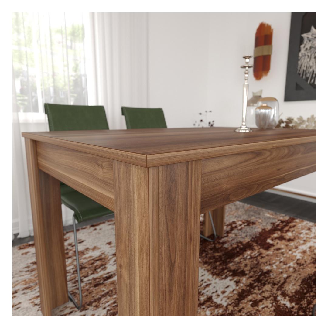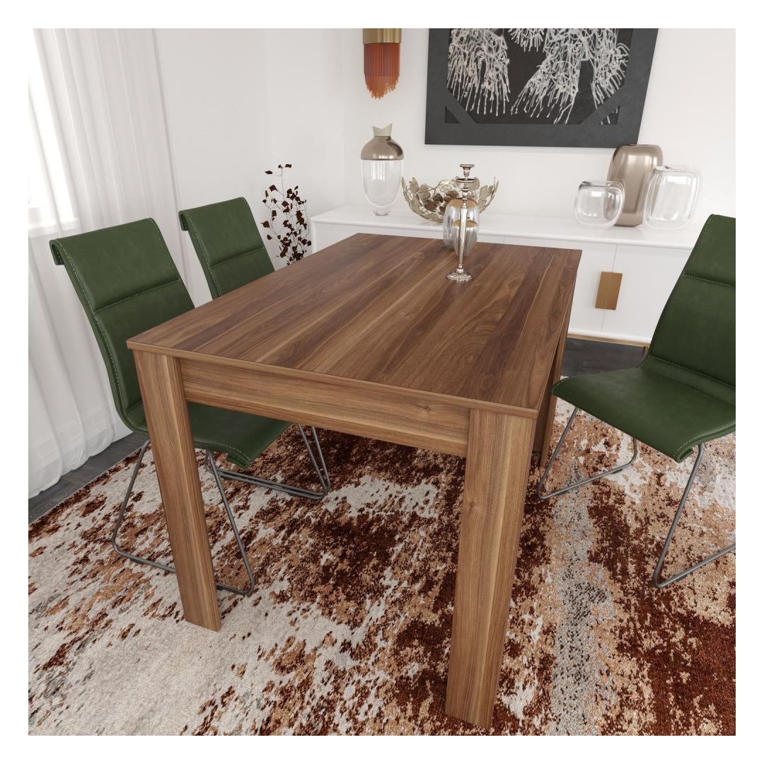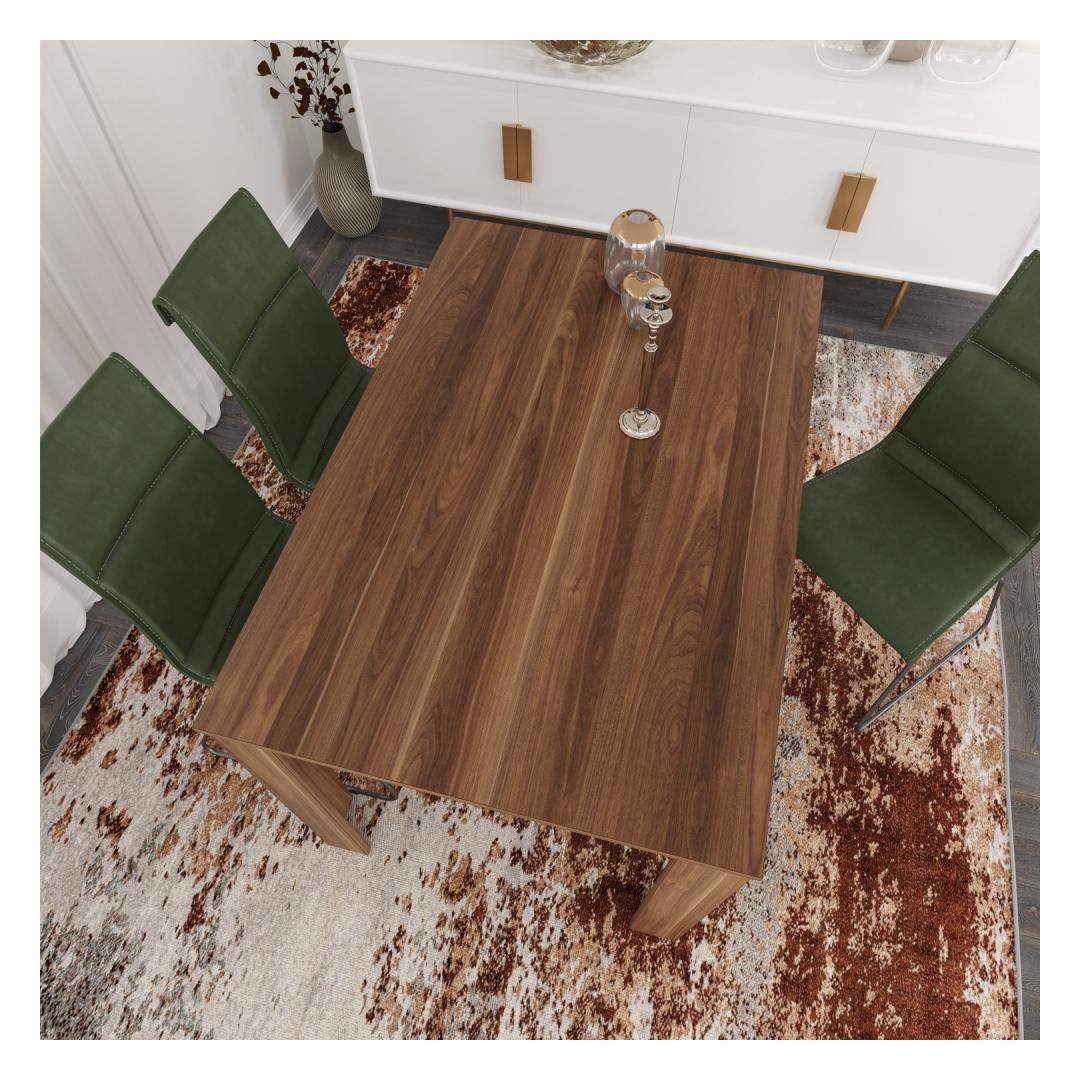 Featuring a solid color concept, this dining table exudes an air of sophistication and elegance, instantly enhancing the aesthetic appeal of your dining space. The rich Walnut color(s) add a touch of warmth and charm, creating a welcoming atmosphere for your family and guests.