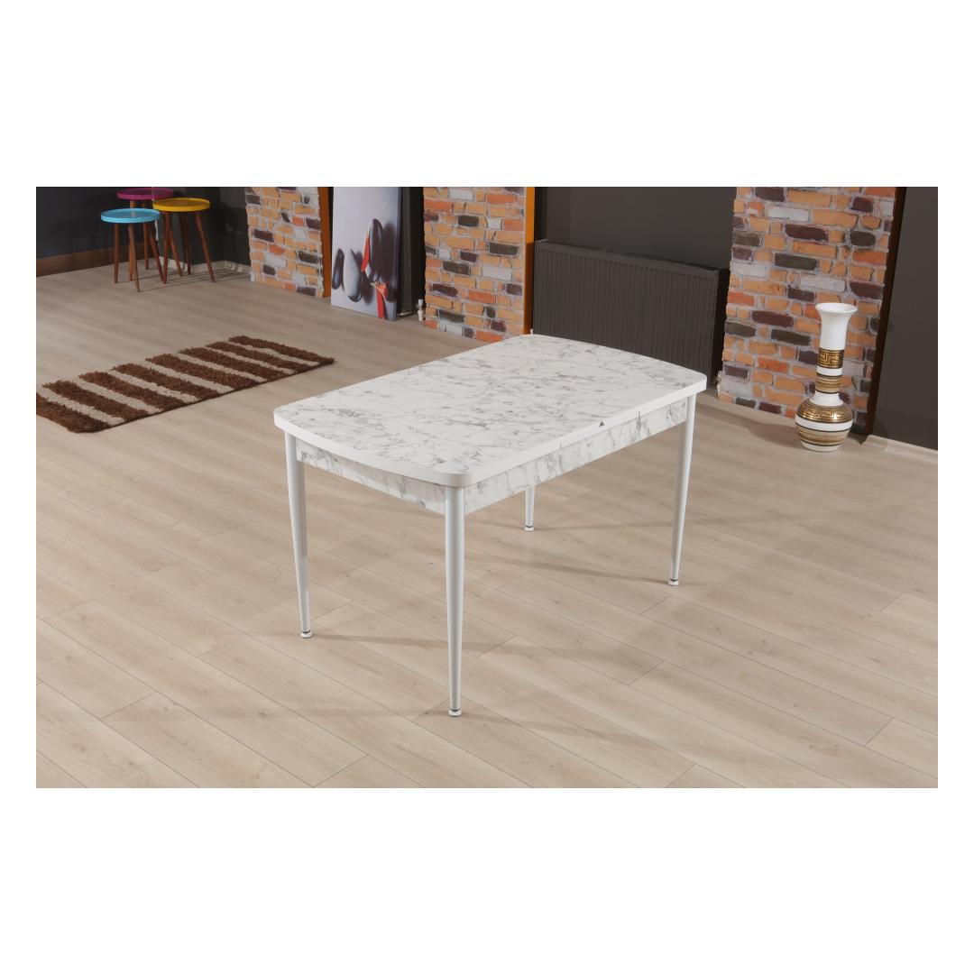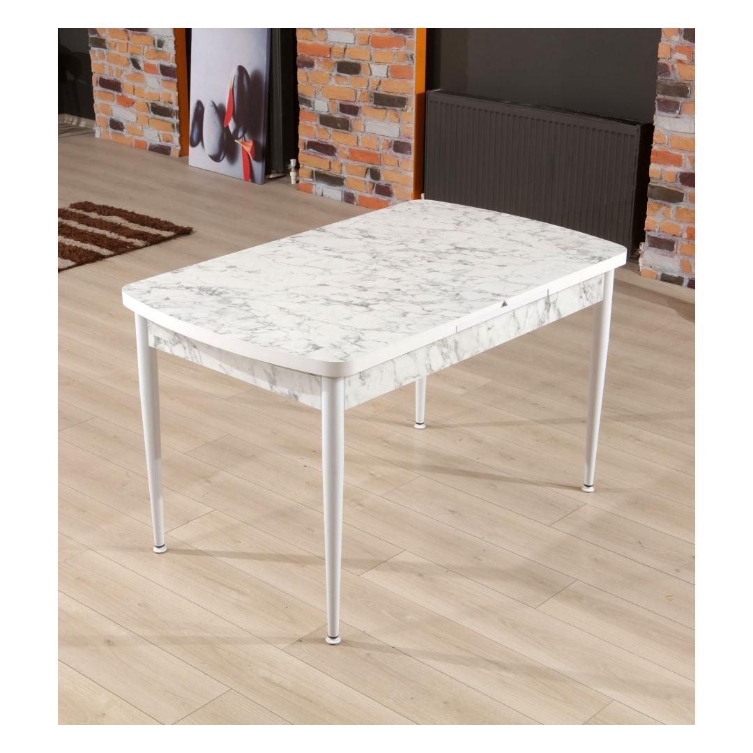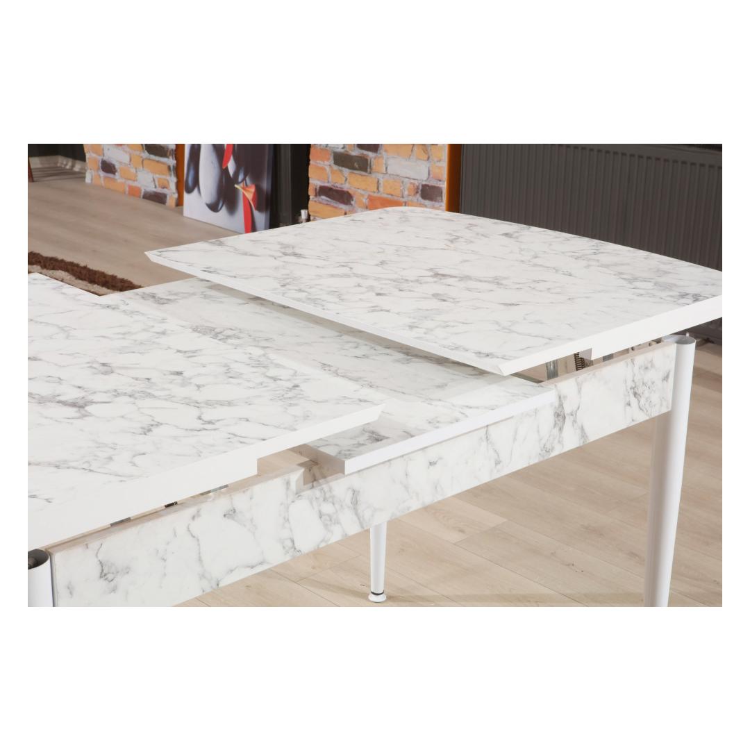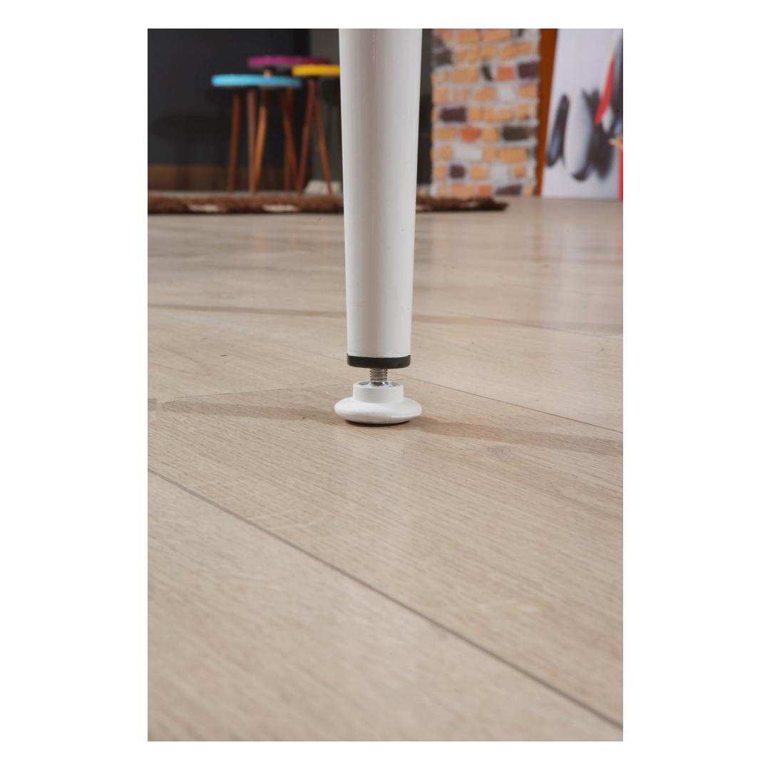 Etsitkö täydellistä ruokapöytää, jonka ääreen kerätä rakkaasi? Katso vain upeaa laajennettavaa ruokapöytäämme! Tämä upea kappale ei ole pelkkä pöytä, vaan tyylikkyyden ja tyylin ilmentymä, joka kohottaa ruokasalisi ilmettä.Eleganssia ja toiminnallisuutta yhdessäPidennettävä ruokapöytä on valmistettu 100-prosenttisesti melamiinipäällystetystä lastulevystä, mikä takaa kestävyyden ja pitkäikäisyyden. Tyylikäs muotoilu sisältää kauniin valkoisen ja harmaan väriyhdistelmän, joka tuo modernin kosketuksen mihin tahansa tilaan. Metallijalat tarjoavat vakautta ja tukea, joten tämä pöytä on paitsi tyylikäs myös käytännöllinen jokapäiväisessä käytössä.Luo ikimuistoisia hetkiäVoi kuvitella isännöivänsä illallisia ja perhejuhlia tämän kauniin pöydän ympärillä ja luoden muistoja, jotka kestävät koko elämän. Pöydän leveys on 132 cm ja korkeus 79 cm, joten vieraat istuvat siinä mukavasti. Tarvitsetko enemmän tilaa? Jatka pöytää yksinkertaisesti 170 cm leveäksi, jotta pöytään mahtuu lisää vieraita.Tekniset tiedot:Materiaali:100 % melamiinipäällysteinen lastulevyPaksuus: 18 mmLeveys: 132 cmKorkeus: 79 cmKorkeus: 76,5 cmPöydän laajennettu leveys: 170 cmMetallijalatVäri: Valkoinen ja harmaaÄlä missaa tätä upeaa laajennettavaa ruokapöytää. Lisää se ostoskoriin nyt ja muuta ruokasalisi tilaksi, jossa tehdään muistoja ja jaetaan naurua. Väri: Valkoinen harmaa