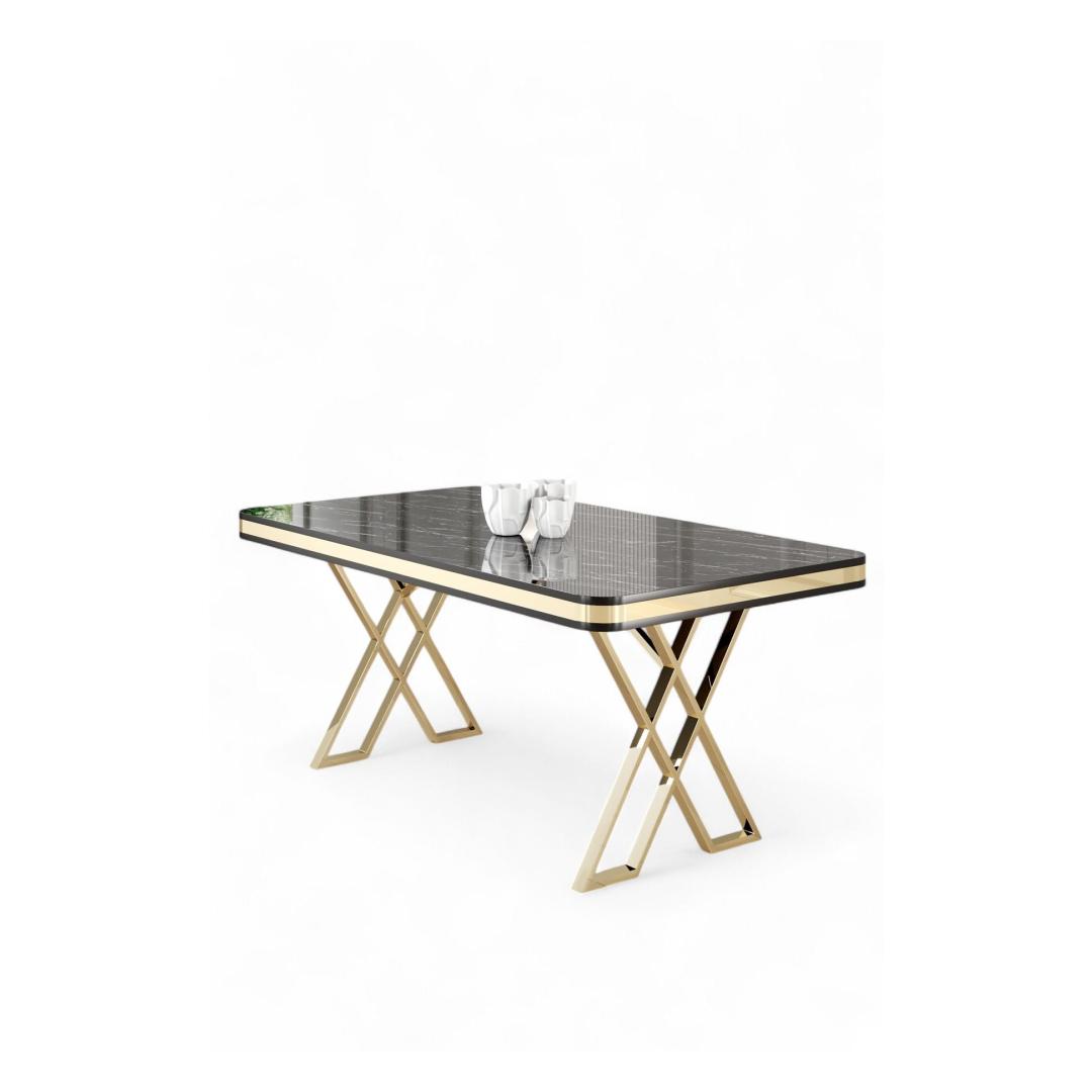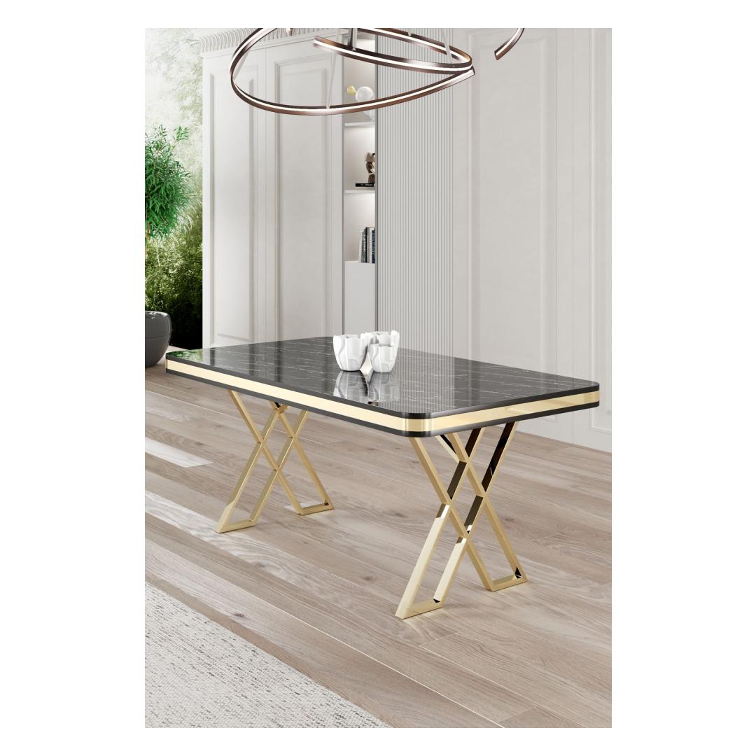 Muuda oma söögituba luksuslikuks ja elegantseks ruumiks meie hämmastava söögilaua abil. Valmistatud 100% lakitud paneelist ja stiilsetest metalljalgadest, kiirgab see laud rafineeritust ja stiili. Musta marmi ja kuldsete aktsentide kombinatsioon lisab igasse söögikohta glamuurset puudutust, muutes selle teie kodu ideaalseks keskpunktiks.Tõsta oma söögikogemus uuele tasemeleImetle oma külalisi selle kauni söögilauaga, mis mitte ainult ei näe välja ilus, vaid pakub ka tugevat ja vastupidavat pinda kõigi teie toitude ja koosolekute jaoks. Sujuv disain ja kaasaegne värvipalett muudavad selle mitmekülgseks tükiks, mis sobib igasuguste sisustustüüpidega, alates kaasaegsest kuni traditsioonilise.Loo kestvaid mälestusiKogunege selle kauni söögilaua ümber oma lähedastega ja looge unustamatuid mälestusi maitsvate toitude ja südamlike vestluste saatel. Avardatud mõõtmed pakuvad piisavalt ruumi, et kõik saaksid mugavalt istuda ja üksteise seltskonnast nautida.Tehnilised andmed:Materjal: 100% lakitud paneelJalad: MetallMõõtmed: Laius 130 cm, Kõrgus 74 cm, Sügavus 80 cmVärv: Must marmor ja kuld Värv: Black Marble Gold