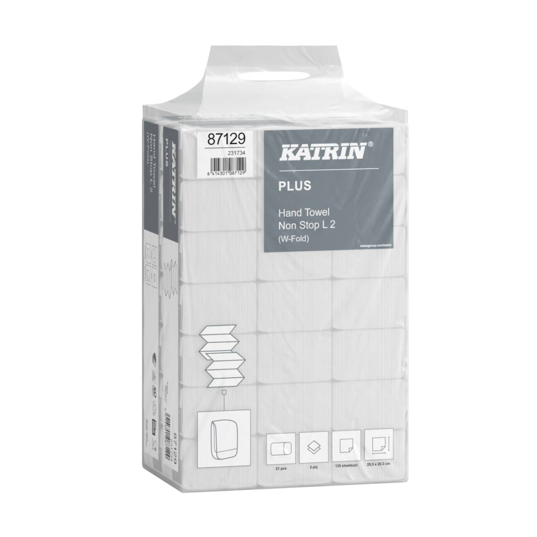 Katrin Plus folded hand towel offers the softest professional washroom experience for your guests, employees and customers. The W-fold hand towel exits the dispenser sheet by sheet, controlling consumption and ensuring a quality user experience. Features: • Non Stop, interwoven W-fold hand towels for hygienic, efficient and gentle hand drying • Katrin Plus Large sheets offer excellent absorbency and better durability - also suitable for stronger wiping with less sheet consumption • 100 sheets per pack • 2-ply, white multifold hand towel • Dermatologically tested and approved • Handy Pack - smart packaging with ergonomic handle, easy to carry and handle • The unique "windmill" relief combines beautiful design and smart technology and ensures effective absorbency and pleasant softness • The glass and fork symbol indicates that the product is suitable for short-term contact with food, e.g. when wiping • The Nordic Ecolabel (Swan) confirms that the product meets strict environmental requirements throughout its life cycle • The EU Ecolabel means that the product meets strict requirements for environmental impact, functionality and user safety • The PEFC label ensures that the wood comes from sustainably managed forests, has been tested by independent auditors • All Katrin hand towels fit all Katrin hand towel dispensers – choose the right dispenser and use the freedom to choose the best hand towel for your guest experience Technical data: • Colour: white • Package dimensions (L × W × H): 203 × 85 × 130 mm • Sheets: 100 • Sheet dimensions (L × W): 340 × 203 mm • Number of layers: 2 • Weight: 297 g