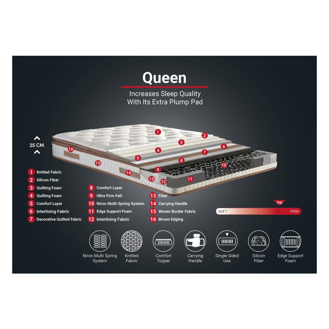 Luksus kodusMuuda oma magamistuba luksuslikuks hotellisviidiks meie kuninganna madratsi abil. See madrats on loodud ülima mugavusega ja pakub teile unenägusid, mis ei ole võrreldavad teistega. Kogege rõõmu kohevast padjastQueen madrats on varustatud koheva padjaga, mis paneb teid tundma, nagu magaksite pilve peal. Vaju selle plüššpinnale ja lase kõik mured ära sulada. Ütle hüvasti rahututele öödele ja tere rahulikule unele.Võrratu tugi niron multi vedrusüsteemigaMeie madratsil on uuenduslik niron multi spring system, mis tagab ideaalse toe teie vöökohale, kaelale ja selgroole. Enam ei pea ärkama valudega - see madrats hoiab teid kogu öö jooksul mugavalt ja hästi puhanud. Ühispoolne mugavus maksimaalse mugavuse tagamiseksÜhepoolse kasutamise korral on kogu mugavus koondunud madratsi ühele pinnale. See tähendab, et saate madratsit kasutada aastaid, ilma et peaksite seda ümber keerama. See on ideaalne lahendus neile, kes hindavad mugavust ja kasutusmugavust. Tõstke oma magamistoa sisekujundustKuninganna madrats ei paku mitte ainult erakordset mugavust, vaid lisab teie magamistoale ka elegantsi. Dekoratiivne tepitud linasest kangast kangas annab sellele keerulise välimuse, mis koheselt uuendab teie magamisruumi. Tehnilised üksikasjad:Kate: Kangas: Riidest kangasLaius: 200 cmSügavus: 200 cmKõrgus: 25 cmSilikoonkiudMugavuskihiÜlimalt kindel viltServa tugivahtKokkupandudInvesteerige oma unesse ja kogege ülimatut mugavust ja luksust meie queen madratsiga. Ütle hüvasti rahututele öödele ja tere noorendavale uneelamusele. Uuendage oma magamistuba juba täna ja nautige kõrgema unekvaliteedi eeliseid koos lisapadjaga! Värv: White Brown