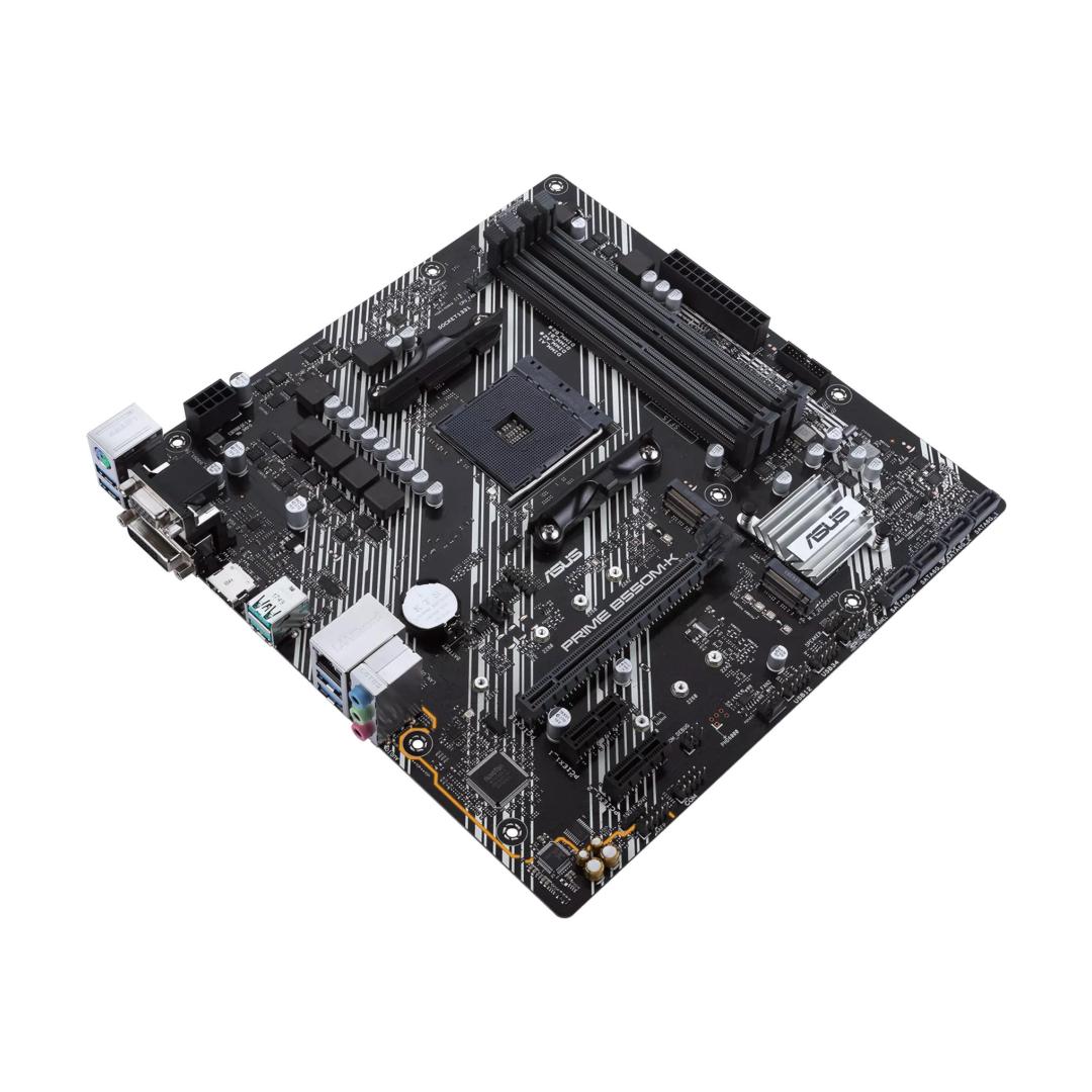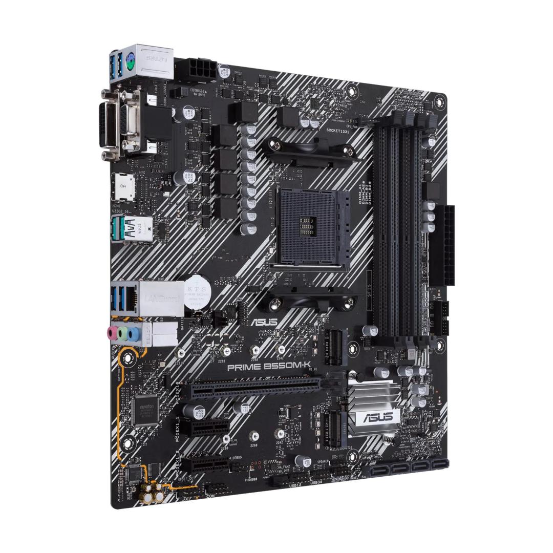 ASUS PRIME B550M-K. Processor manufacturer: AMD, Processor socket: Socket AM4, Compatible processor series: AMD Ryzen 3000 Series. Supported memory types: DDR4-SDRAM, Maximum internal memory: 128 GB, Memory slots type: DIMM. Supported storage drive interfaces: M.2, SATA. LAN controller: Realtek RTL8111H. Motherboard form factor: micro ATX, Motherboard chipset family: AMD, Motherboard chipset: AMD B550
