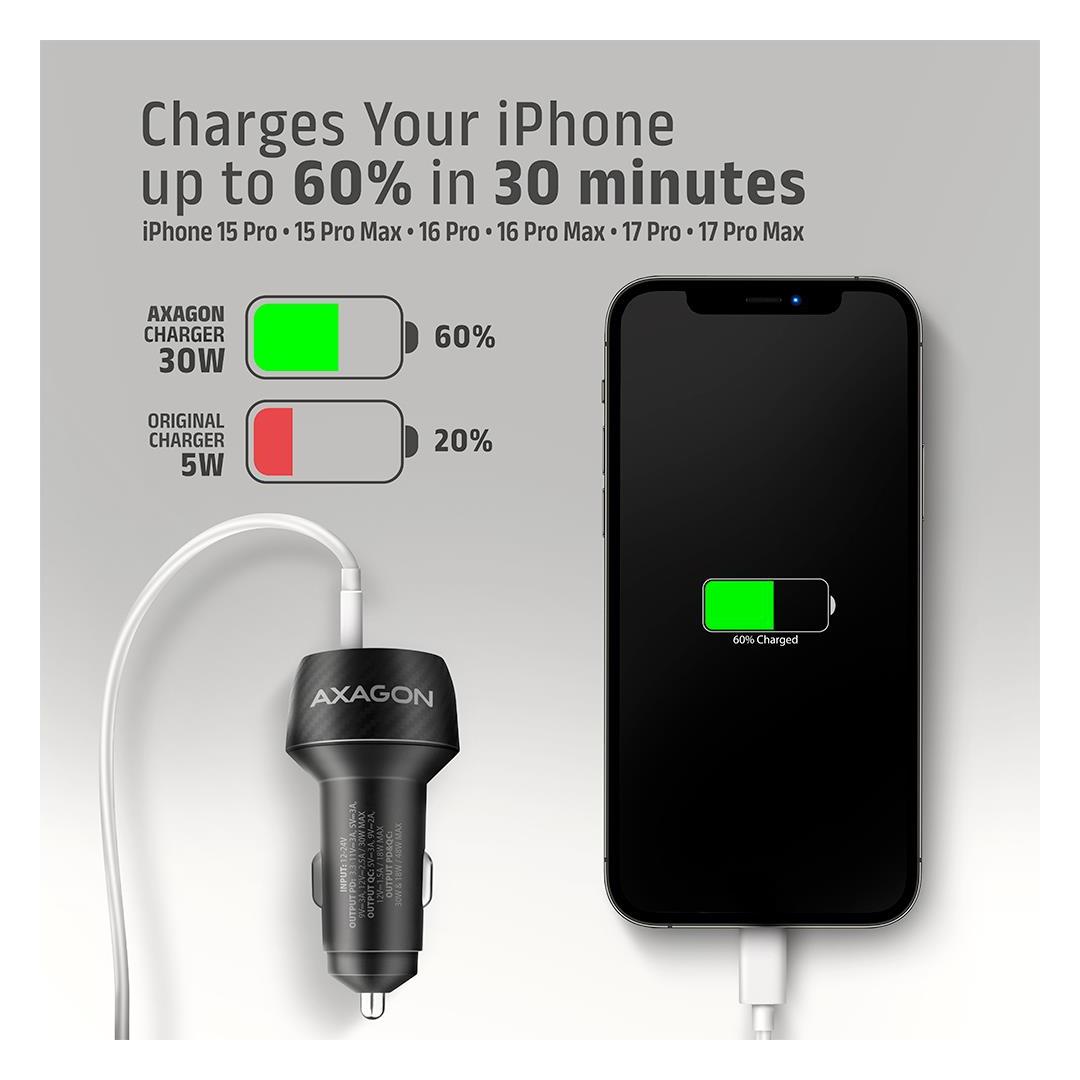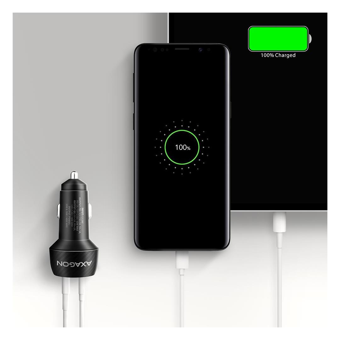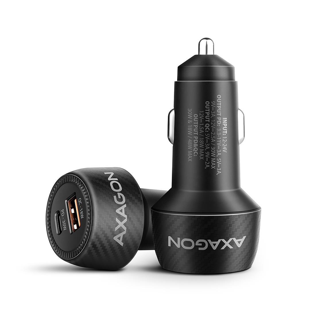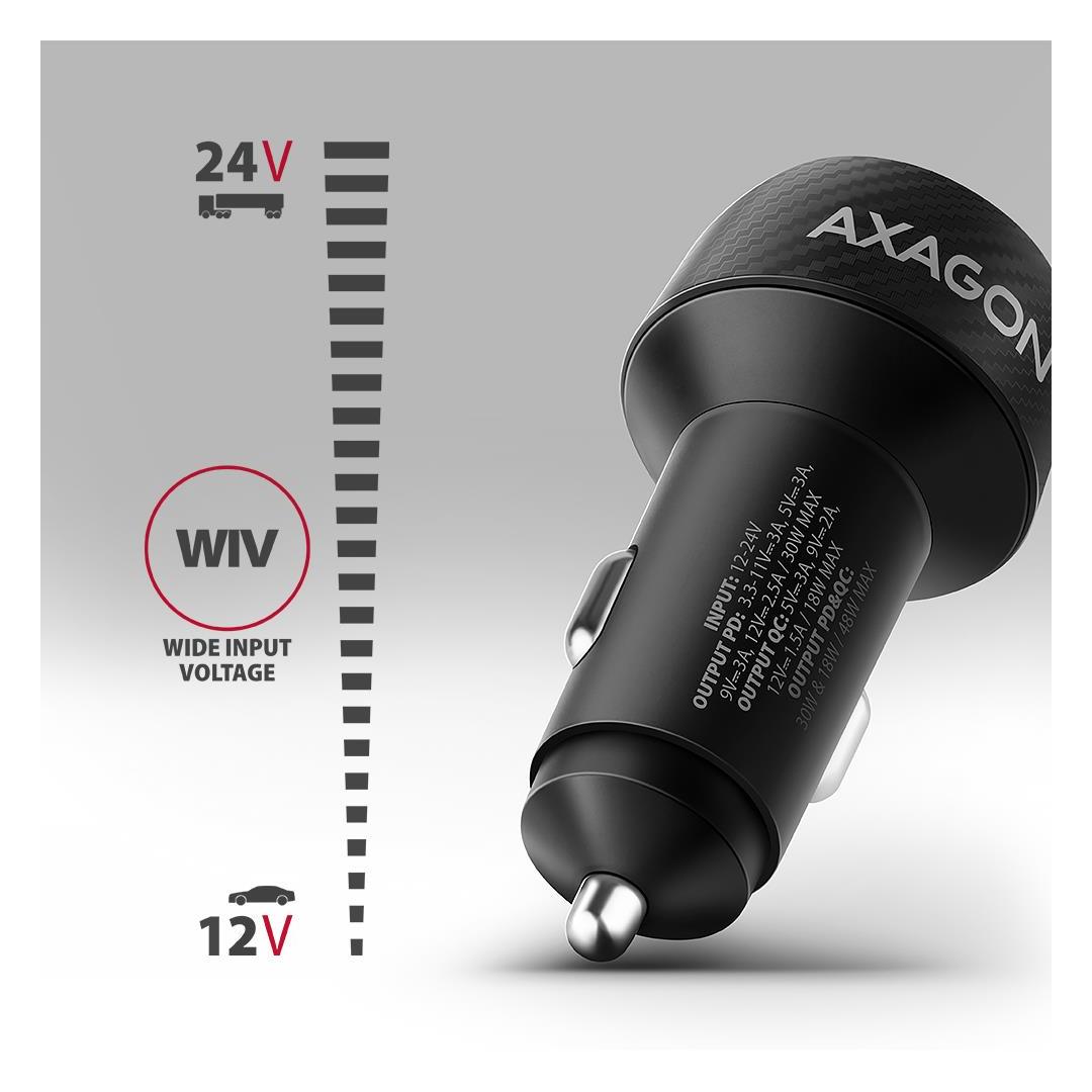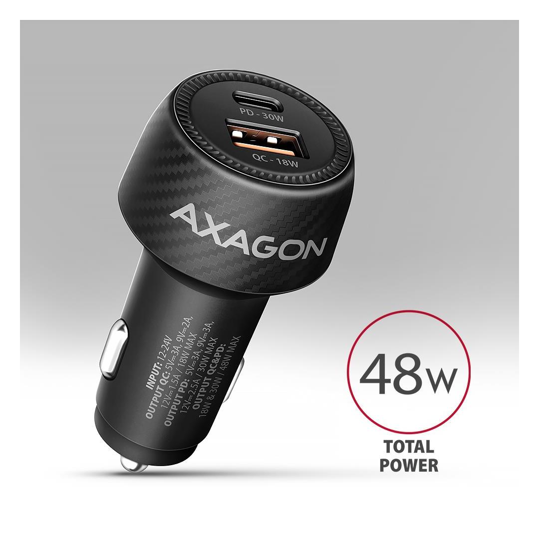 Axagon PWC-PQ48 PD3.0 & QC4+ 2xOUTPUTS car charger 48W. Charger type: Auto, Power source type: Cigar lighter, Charger compatibility: Universal. Input voltage: 12 - 24 V. USB 2.0 ports quantity: 1, USB Type-C ports quantity: 1, Fast charging, Power protection features: Over current, Over voltage, Overheating, Short circuit. Product colour: Black