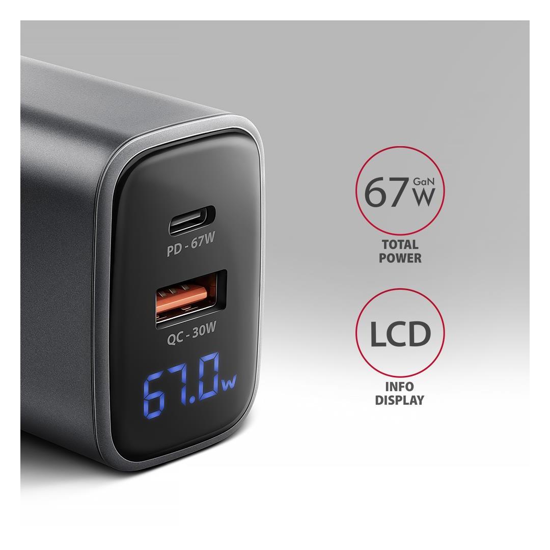 Axagon ACU-PQ67D PD3.0 & QC4+ 2xOUTPUTS, LCD display, wall charger 67W. Charger type: Indoor, Power source type: AC, Charger compatibility: Universal. Input voltage: 100 - 240 V. USB 2.0 ports quantity: 1, USB Type-C ports quantity: 1, Fast charging, Power protection features: Over current, Over voltage, Overheating, Short circuit. Product colour: Black, Grey