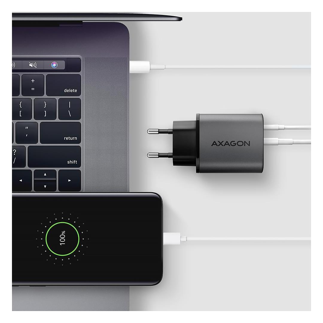 Matkojen seinälaturi AXAGON ACU-PQ67D GaN mahdollistaa jopa kahden mobiililaitteen nopean lataamisen samanaikaisesti. Kokonaislähtötehon 67 W ansiosta laturi voi ladata kannettavia tietokoneita, tabletteja, puhelimia ja muita mobiililaitteita suurimmalla mahdollisella nopeudella. Sovittimessa on tavallisen USB-A-liittimen lisäksi myös käännettävä USB-C-liitin. Selkeä LCD-näyttö näyttää nykyisen lataustehon.