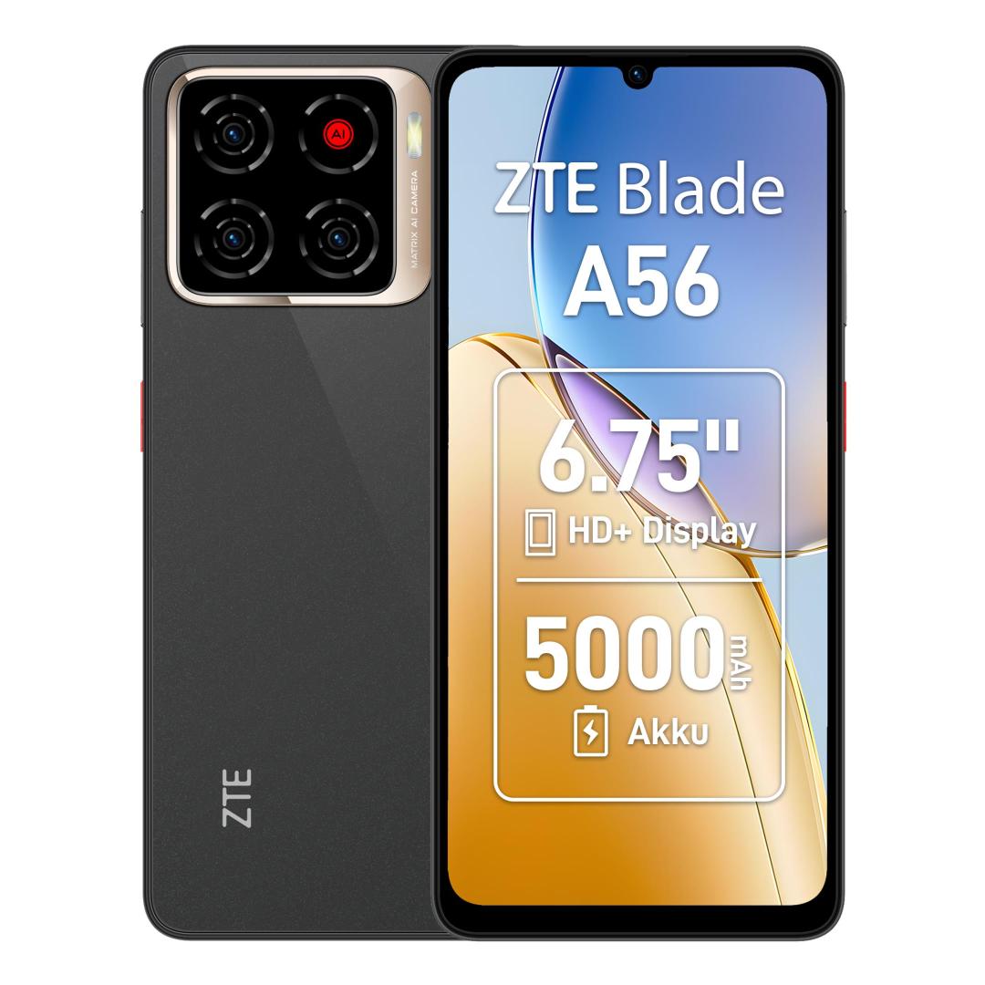 ZTE Blade A56. Display diagonal: 17.1 cm (6.75"), Display resolution: 1600 x 720 pixels. Processor frequency: 1.6 GHz, Processor family: Unisoc, Processor model: T7200. RAM capacity: 4 GB, Internal storage capacity: 128 GB. Rear camera resolution (numeric): 13 MP, Rear camera type: Triple camera. SIM card capability: Dual SIM. Operating system installed: Android 15. Battery capacity: 5000 mAh. Product colour: Black. Weight: 193 g