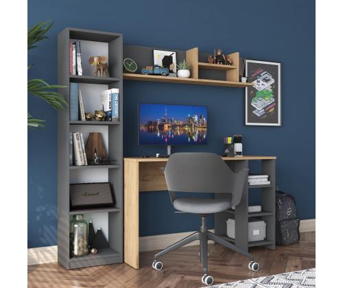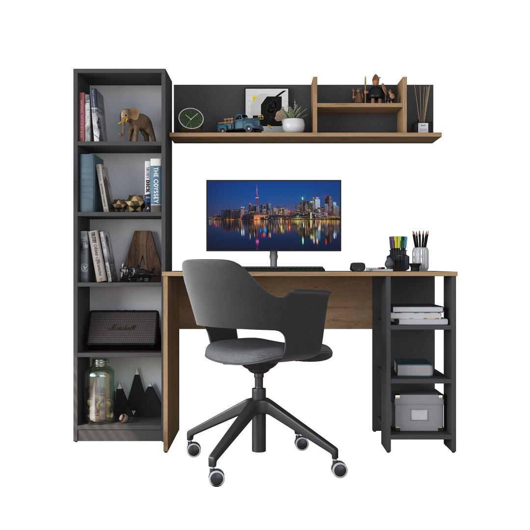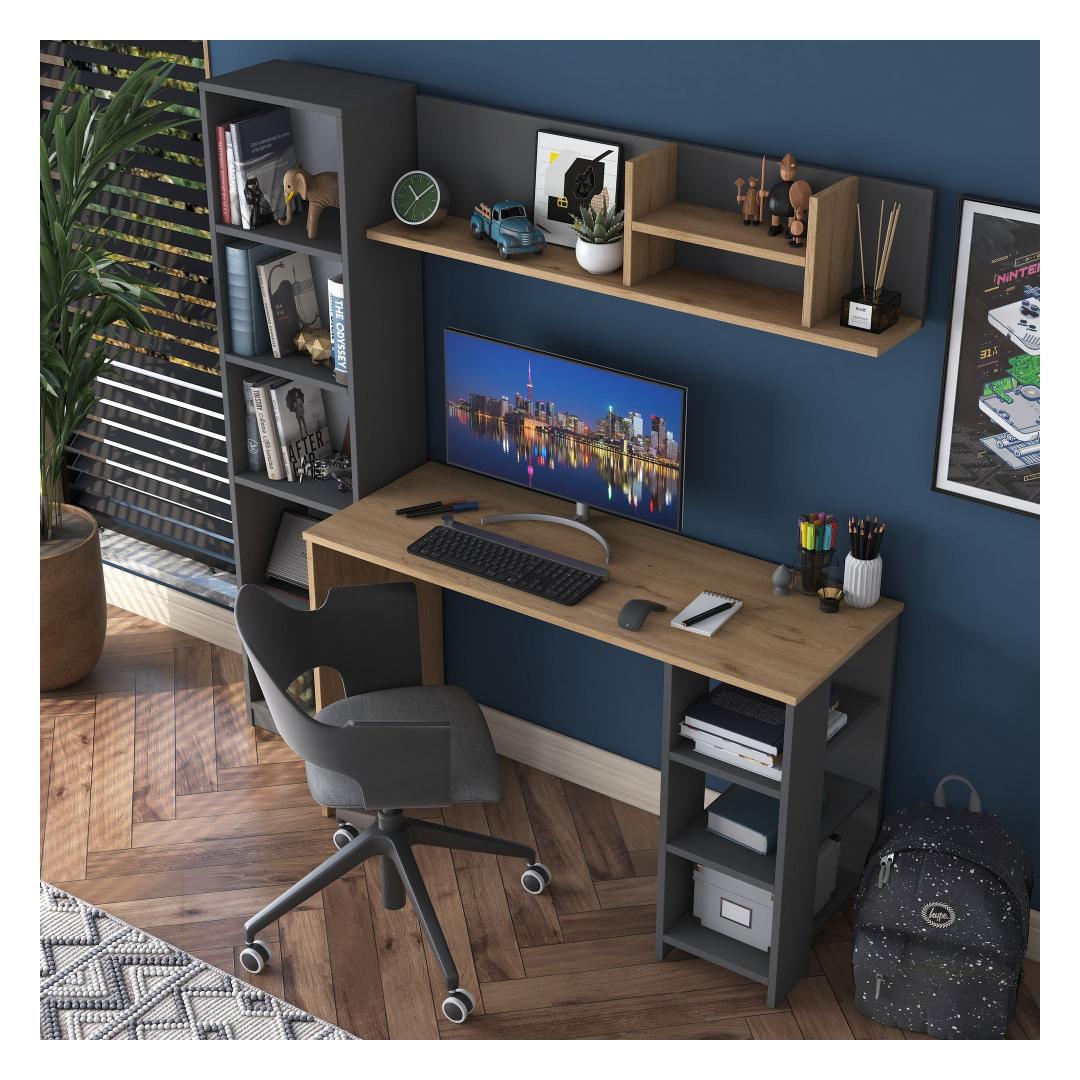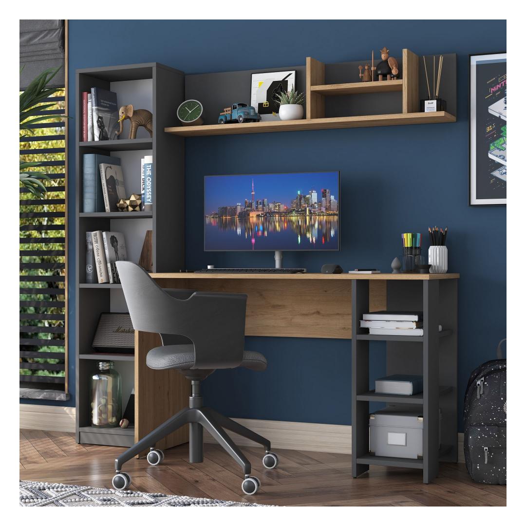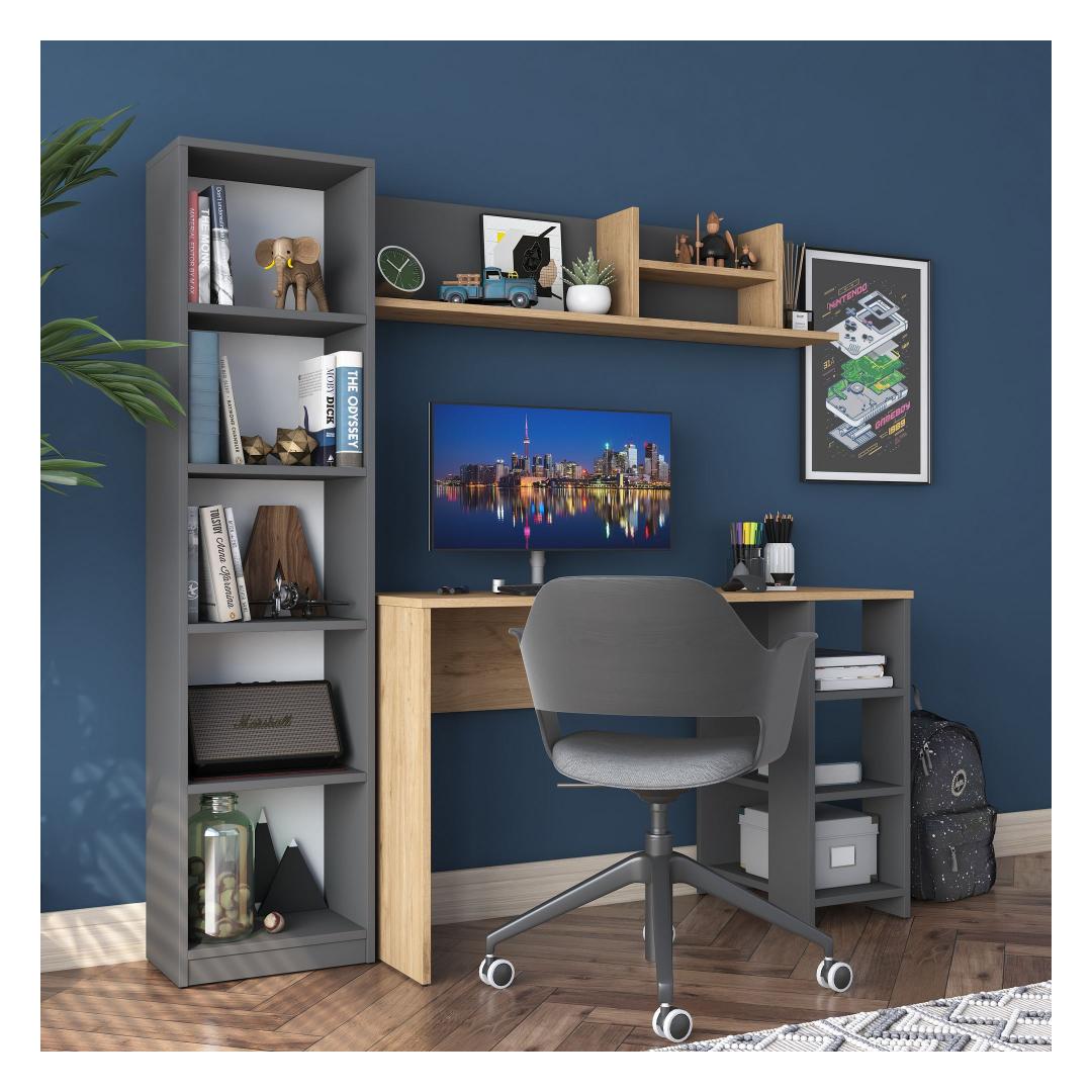 Muuda oma õpingute ruum produktiivsuse ja organiseerituse pelgupaigaks meie õpingute laua ja raamaturiiuli komplektiga. Valmistatud 100% melamiinkattega puitlaastplaadist, on see laud ja raamaturiiul mitte ainult vastupidavad, vaid ka stiilsed, muutes need ideaalseks lisandiks igasse kaasaegsesse koju.Tõhus disain maksimaalse funktsionaalsuse jaoksÕpingute laud on varustatud avara lauapinnaga, mis on ideaalne raamatute ja märkmete laiali laotamiseks õppimise ajal. Kinnitatud raamaturiiul pakub piisavalt ruumi kõigi teie lemmiklugemiste jaoks, hoides need käeulatuses kiireks juurdepääsuks. Lisaks lisab seina riiul täiendavat hoiuruumi väiksematele esemetel või dekoratiivsetele detailidele, aidates hoida teie tööruumi korras.Elegantne pähklipuu ja antriitviimistlusLihtne pähklipuu ja antriitvärvi kombinatsioon lisab teie õpingute ruumile elegantsi, tõstes teie toa üldist esteetikat. Olenemata sellest, kas olete üliõpilane või professionaal, inspireerib see laud ja raamaturiiul teid töötama rohkem ja nutikamalt, samal ajal näidates välja vaevata šikki välimust.Tehnilised andmed:Materjal: 100% melamiinkattega puitlaastplaatPaksus: 18 mmÕpingute laua mõõtmed: Laius: 120 cm, Kõrgus: 73.8 cm, Sügavus: 45 cmRaamaturiiuli mõõtmed: Laius: 40 cm, Kõrgus: 161.8 cm, Sügavus: 25 cmSeina riiuli mõõtmed: Laius: 120 cm, Kõrgus: 25 cm, Sügavus: 19.8 cmKokku suurus: Laius: 160 cm, Kõrgus: 161.8 cm, Sügavus: 45 cmVärv: Pähklipuu ja antriit Värv: Walnut Anthracite