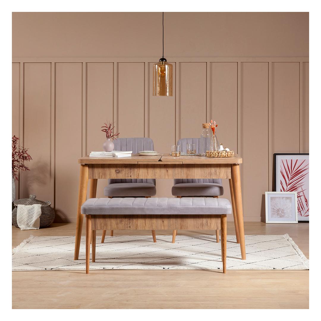 The dining table boasts a sleek design with a width of 130 cm, height of 77 cm, and depth of 80 cm. When fully extended, it reaches a width of 165 cm, making it perfect for hosting dinner parties or family gatherings. The chairs and bench are upholstered in luxurious velvet fabric, providing both comfort and style.