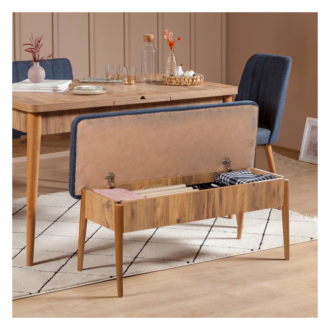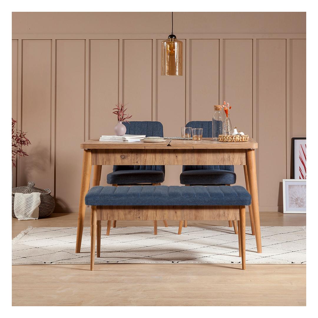 The dining table features a sleek Atlantic Pine finish, while the chairs and bench are upholstered in a rich Dark Blue color, creating a modern and chic look. The extendable feature allows you to easily accommodate guests and create more space when needed, making it ideal for both everyday meals and special occasions.