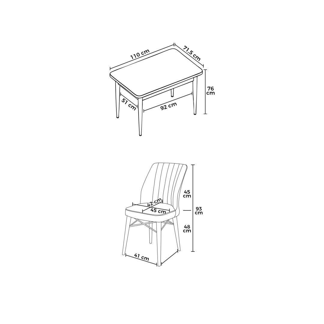 Muuda oma söögituba stiilseks ja kutsuvaks ruumiks meie suurepärase söögilaua ja toolide komplektiga. Valmistatud 100% melamiinkattega puitlaastplaadist ja tugevatest puidust jalgadest, kiirgab see komplekt elegantsi ja vastupidavust. Toolide raamid on valmistatud metallist puidust jalgadega, et tagada lisastabiilsus ja võlu. Kasutatud kangas on Jerry, tuntud oma mugavuse ja vastupidavuse poolest.Tõsta oma söögikogemustSöögilaud mõõdab 110 cm laiust, 76 cm kõrgust ja 71 cm sügavust, pakkudes piisavalt ruumi, et teie pere ja külalised saaksid kokku tulla. Toolide laius on 45 cm, kõrgus 90 cm ja sügavus 42 cm, mugava istumiskõrgusega 46 cm. 22 DNS vaht selja jaoks ja 28 DNS vaht istumise jaoks tagavad maksimaalse mugavuse pikkade söögikordade ja vestluste ajal.Elegantne disain, püsiv kvaliteetKomplektis on rafineeritud musta marmi ja musta värvi kombinatsioon, mis lisab teie söögialale modernsuse puudutuse. Olgu tegemist õhtusöögipidamise või rahuliku eine nautimisega lähedastega, see komplekt täiustab teie ruumi atmosfääri. Ära jäta kasutamata võimalust uuendada oma söögituba meie hämmastava söögilaua ja toolide komplektiga.Tehnilised andmed:Materjal: 100% melamiinkattega puitlaastplaat, metalltoolide raamKangas: JerrySöögilaua mõõtmed: 110 cm (L) x 76 cm (K) x 71 cm (S)Toolide mõõtmed: 45 cm (L) x 90 cm (K) x 42 cm (S)Istumiskõrgus: 46 cmVaht: 22 DNS selja jaoks, 28 DNS istumise jaoksVärv: Must marmor ja must Värv: Black Marble Black