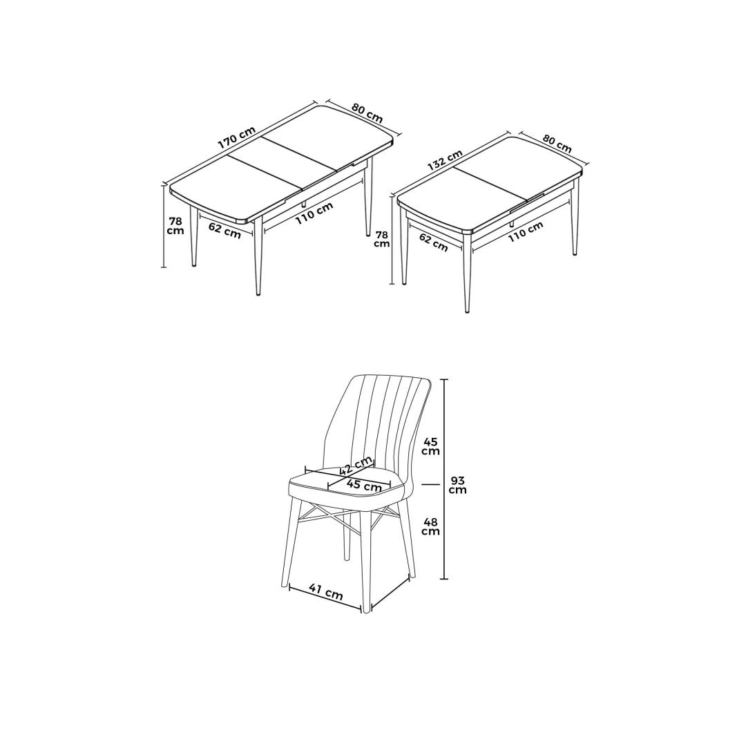 Muuda oma söögituba elegantsi ja rafineerituse ruumiks meie pikendatava söögilaua ja toolide komplektiga. See 7-osaline komplekt on valmistatud 100% MDF-ist ja sellel on vastupidavad puidust jalad, mis tagavad vastupidavuse ja stiili. Toolide raamid on valmistatud metallist puidust jalgadega, andes disainile modernse puudutuse.Elegantne disain teie kodusSöögilaud mõõdab 132 cm laiuses, 78 cm kõrguses ja 80 cm sügavuses, pakkudes piisavalt ruumi teie perele ja külalistele. Täielikult avatud olekus ulatub laua laius 170 cm-ni, mis on ideaalne õhtusöökide või eriliste sündmuste korraldamiseks. Toolid on disainitud mugavuseks, kasutades 22 DNS vahtu seljatoe jaoks ja 28 DNS vahtu istumise jaoks, tagades iga kord hubase söögikogemuse.Aegumatu värvikombinatsioonKomplekt on saadaval klassikalises valge ja kreemi kombinatsioonis, lisades igasse söögituppa rafineerituse. Olgu tegemist juhusliku eine nautimisega perega või ametliku õhtusöögi korraldamisega, see söögikomplekt jätab kindlasti teie külalistele mulje.Tehnilised andmed:Materjal: 100% MDF laud puidust jalgadega, metallist tooliraamid puidust jalgadegaKangas: JerrySöögilaua mõõtmed: 132 cm (L) x 78 cm (K) x 80 cm (S) (1 tk)Ava söögilaua mõõtmed: 170 cm (L) x 78 cm (K) x 80 cm (S)Tooli mõõtmed: 45 cm (L) x 90 cm (K) x 42 cm (S) (6 tk)Iste kõrgus: 46 cmVaht: 22 DNS seljatoe jaoks, 28 DNS istumise jaoksVärv: Valge ja kreem Värv: White Cream