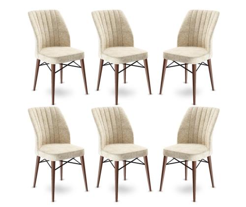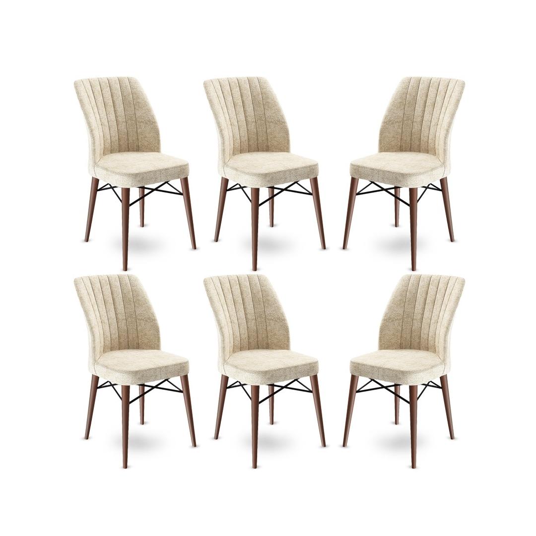 Muuda oma söögituba stiilseks ja kutsuvaks ruumiks meie 6-osalise toolikomplektiga. Need toolid on valmistatud vastupidavast 100% metallraamist ja luksuslikust Babyface kangast, mis teeb need mitte ainult vastupidavaks, vaid ka äärmiselt mugavaks.Elegantne DisainKreemja ja pruuni värvikombinatsioon lisab igasse söögiruumi natuke rafineeritust, samas kui puidust jalad pakuvad klassikalist, kuid samas modernset ilmet. Nende toolide voolujooneline disain tõstab koheselt teie kodu esteetikat.Mugav Istumine18 DNS vaht selja jaoks ja 22 DNS vaht istumise jaoks pakuvad need toolid ideaalset tasakaalu toe ja mugavuse vahel. 48 cm istme kõrgus tagab, et teie ja teie külalised saavad mugavalt tunde istuda.Kestva KonstruktsioonMetallraam ja puidust jalad teevad need toolid äärmiselt tugevaks ja pikaealiseks. Võite olla kindel, et need toolid taluvad igapäevast kasutamist ja püsivad aastaid heas seisukorras.Parandage oma söögikogemust meie 6-osalise toolikomplektiga. Tellige nüüd ja andke oma kodule vajalik uuendus.Tehnilised Üksikasjad:Raam: 100% METALLKangas: BabyfaceLaius: 45 cmKõrgus: 93 cmSügavus: 42 cm (6 tükki)Istme kõrgus: 48 cmJala kõrgus: 44 cmVaht: 18 DNS seljale / 22 DNS istumiseksPuidust jaladVärv: Kreemja ja pruun Värv: Cream Brown