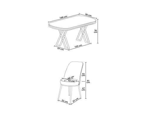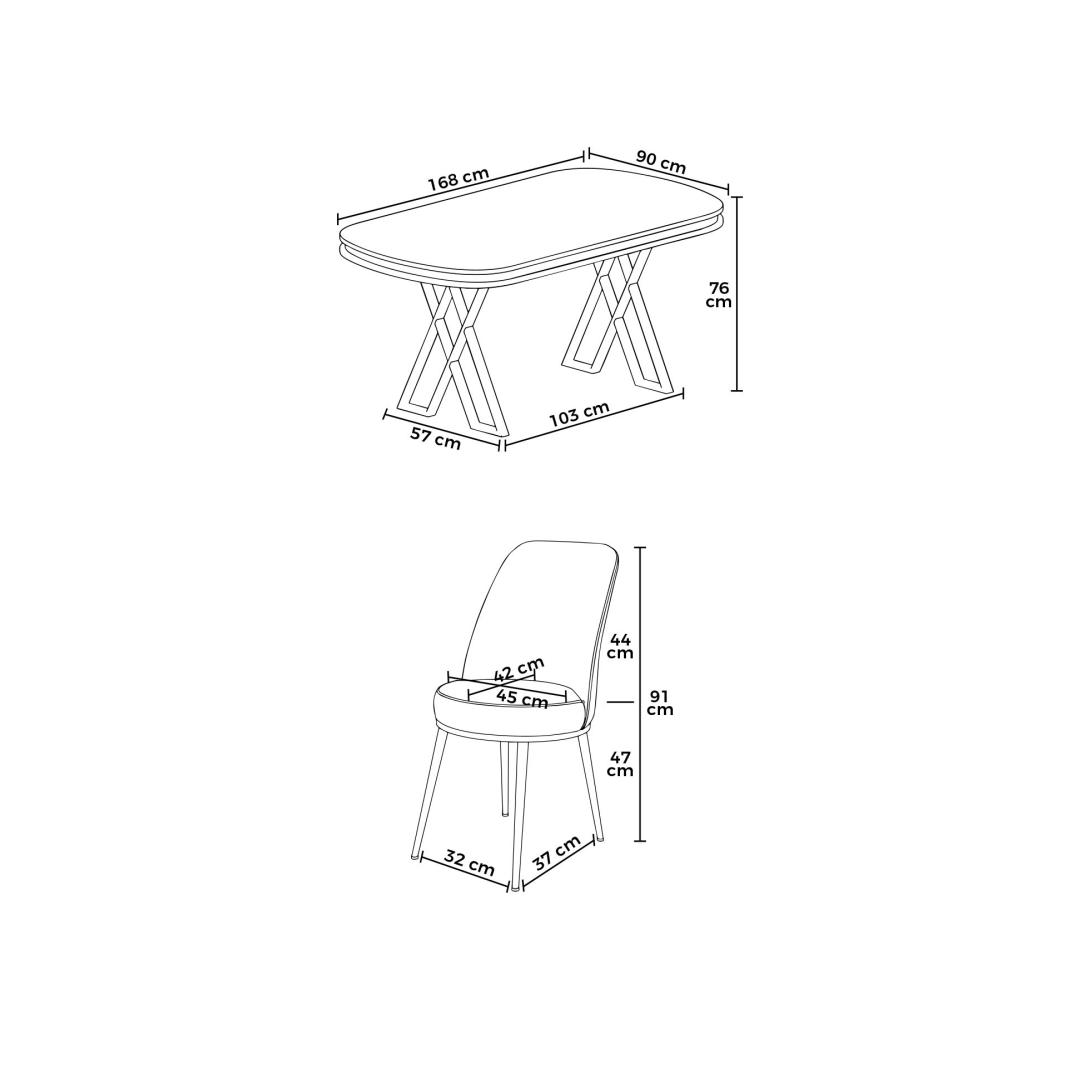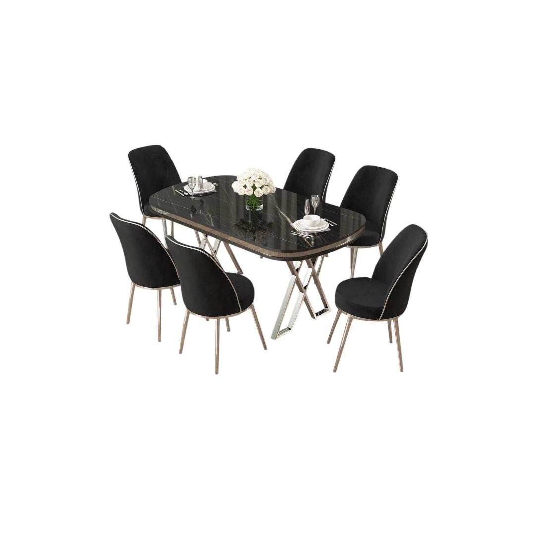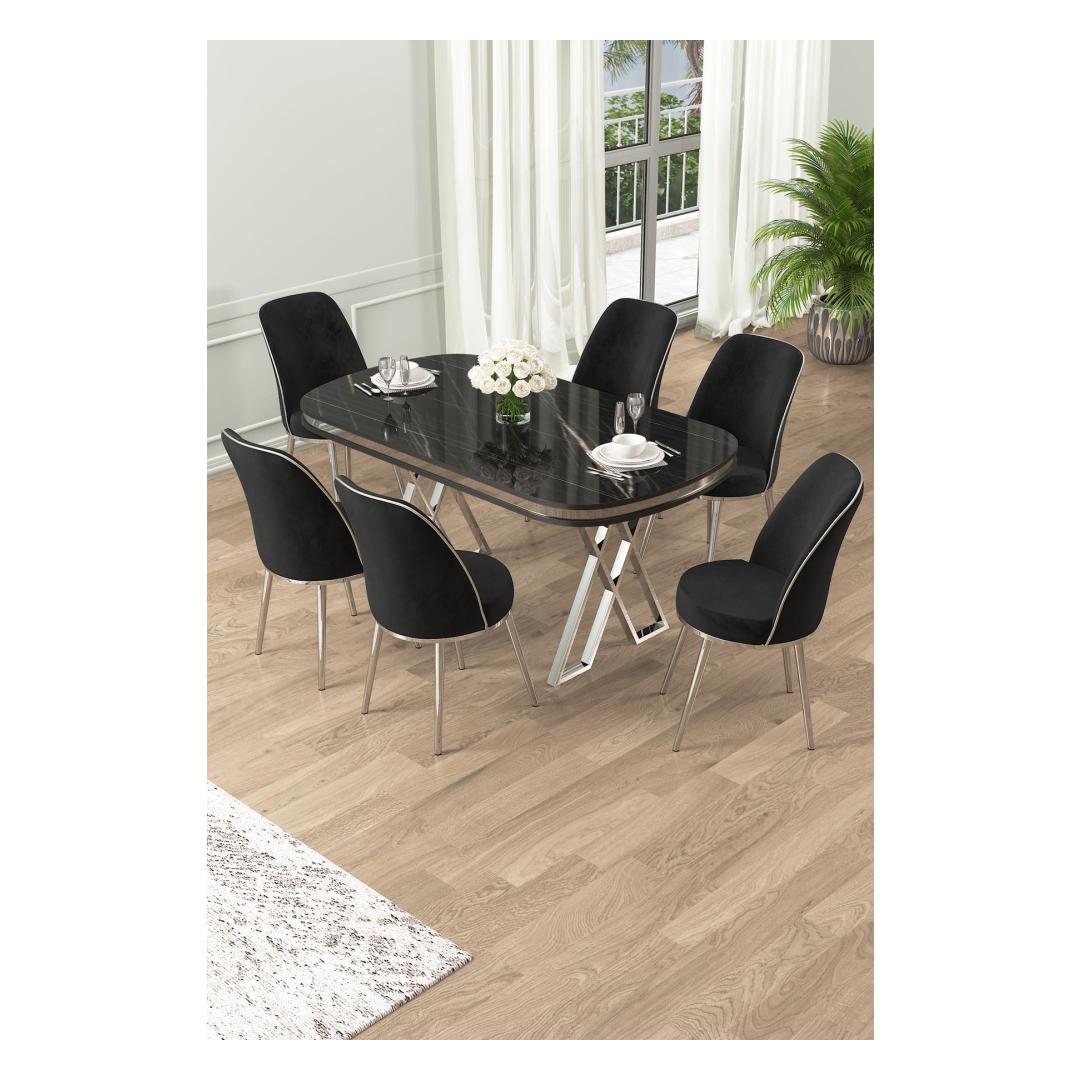 Muuda oma söögituba luksuslikuks ja stiilseks ruumiks meie suurepärase söögilauda ja toolide komplektiga. Valmistatud 100% lakitud paneelist ja stiilsetest metalljalgadest, kiirgab see komplekt elegantsi ja rafineeritust. Toolidel on tugev metallraam ja pehme Babyface kangas, mis tagab maksimaalse mugavuse.Tõsta oma söögikogemus uuele tasemeleImetle oma külalisi selle hämmastava 7-osalise komplektiga, mis sisaldab avarat lauda ja kuut sobivat tooli. Must marmorist laudpind lisab luksuslikkust, samas kui kroomaktsendid toovad teie sisustusse modernse nüansi. Olgu tegemist õhtusöögipeo või peresöögi nautimisega, see komplekt muudab iga söögikogemuse meeldejäävaks.Mugavus kohtub stiiligaToolid on disainitud 22 DNS vahtmaterjaliga seljatoe jaoks ja 28 DNS vahtmaterjaliga istumise jaoks, tagades maksimaalse mugavuse pikkade söögikordade või koosolekute ajal. Stiilne must värvigamma lisab igasse söögituppa rafineeritust, muutes selle komplekti mitmekülgseks ja ajatu lisandiks teie koju.Tehnilised andmed:Materjal: 100% lakitud paneel, metalljaladTooli raam: metallKangas: BabyfaceLaud: Laius 168 cm, Kõrgus 76 cm, Sügavus 90 cmTool: Laius 45 cm, Kõrgus 91 cm, Sügavus 42 cmIste kõrgus: 47 cmVahtmaterjali tihedus: 22 DNS seljatoe jaoks, 28 DNS istumise jaoksVärv: Must marmor, Kroom, Must Värv: Black Marble Chrome Black
