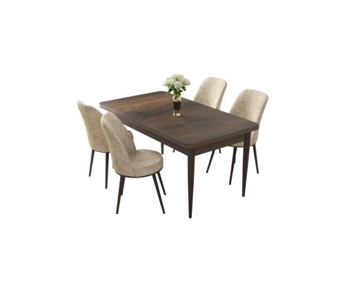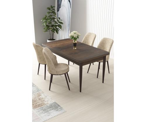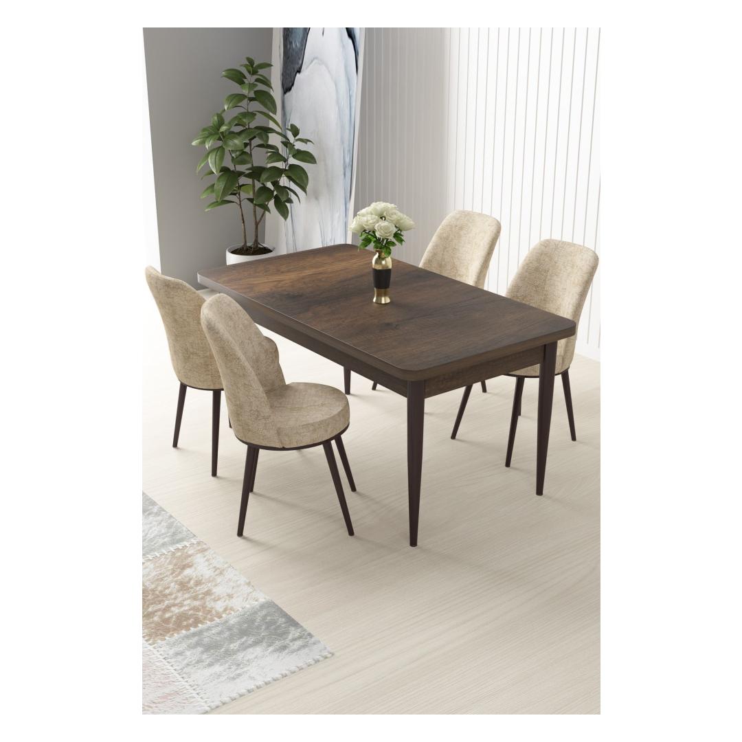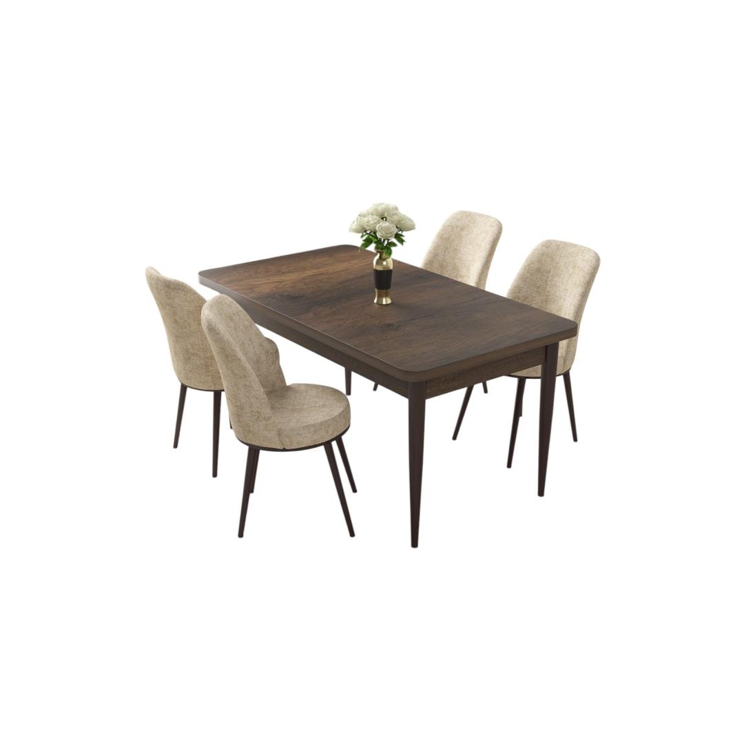 Muuda oma söögituba stiilseks ja kutsuvaks ruumiks meie 5-osalise söögilaua ja toolide komplektiga. Valmistatud 100% melamiinkattega puitlaastplaadist ja tugevatest metalljalgadest, on see komplekt mitte ainult vastupidav, vaid kiirgab ka kaasaegset elegantsi, mis tõstab teie kodu sisustust.Elegantne disain teie kodusSöögilaud on varustatud stiilse disainiga, mille laius on 110 cm, kõrgus 76 cm ja sügavus 71 cm, pakkudes piisavalt ruumi teie perele ja külalistele. Toolide kõrgus on 91 cm ja sügavus 42 cm, need on kaetud Jerry kangaga, et tagada mugav istumiskogemus.Mugavus ja vastupidavusTooliraam on valmistatud metallist, et tagada lisakindlus, samas kui iste ja seljatugi on täidetud 22 DNS vahtkummiga, et pakkuda tuge ja mugavust. Istumisala on täidetud 28 DNS vahtkummiga, et tagada pehme tunne, muutes iga eine luksuslikuks kogemuseks.Baroki ja kreemi värvikombinatsioonKomplekt on saadaval rafineeritud Baroki ja kreemi värvikombinatsioonis, lisades teie söögitoale elegantsi. Olgu tegemist õhtusöögipidamise või rahuliku eine nautimisega lähedastega, see komplekt loob igaks juhuks ideaalse atmosfääri.Tehnilised andmed:Materjal: 100% melamiinkattega puitlaastplaat, metalljaladTooliraam: MetallKangas: JerrySöögilaua mõõdud: Laius 110 cm x Kõrgus 76 cm x Sügavus 71 cm (1 tk)Tooli mõõdud: 45 cm x Kõrgus 91 cm x Sügavus 42 cm (4 tk)Istme kõrgus: 47 cmVaht: 22 DNS seljatoele, 28 DNS istumiseleVärv: Barokk ja kreem Värv: Baroque Cream