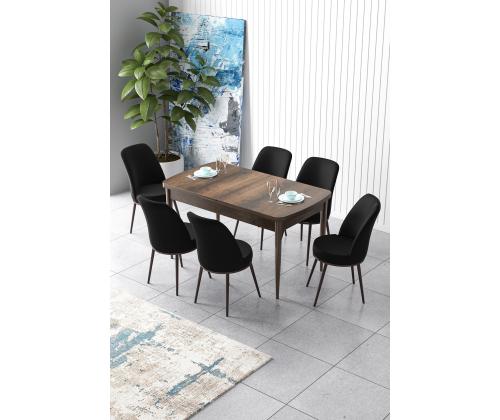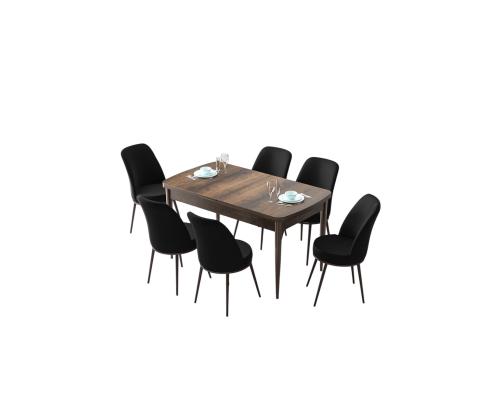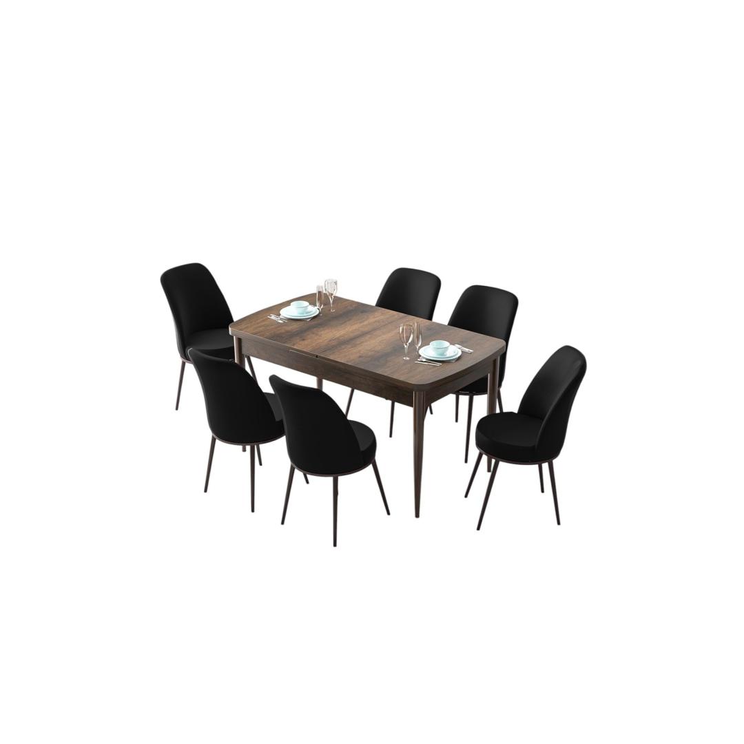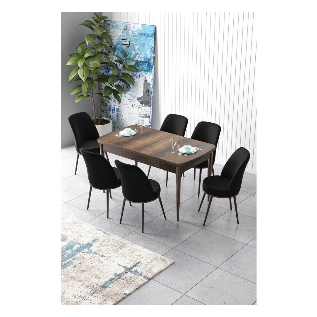 Muuda oma söögituba stiilseks ja kutsuvaks ruumiks meie pikendatava söögilaua ja toolide komplektiga. See 7-osaline komplekt on ideaalne peresündmuste, õhtusöökide või lihtsalt kallite inimestega koos söömiseks.Elegantne disain: Laua sujuvad metalljalad ja 100% MDF konstruktsioon kiirgavad rafineeritust, samas kui Jerry kangast toolid lisavad teie söögialale luksuslikku puudutust.Mitmekülgne: Söögilauda saab hõlpsasti pikendada, et mahutada rohkem külalisi, muutes selle ideaalseks nii intiimsete õhtusöökide kui ka suuremate koosolekute jaoks.Mugav istumine: Toolid on disainitud 22 DNS vahtkummiga seljatoe jaoks ja 28 DNS vahtkummiga istumise jaoks, tagades maksimaalse mugavuse pikkade söögikordade või vestluste ajal.Stiilsed värvid: Baroki ja musta värvi kombinatsioon lisab teie söögiruumi modernse ja šika puudutuse, muutes selle teie kodu kaunistuse keskpunktiks.Uuenda oma söögikogemust meie pikendatava söögilaua ja toolide komplektiga juba täna!Tehnilised andmed:Materjal: 100% MDF laud, metallist tooliraamTooli kangas: JerrySöögilaua mõõtmed: Laius: 132 cm, Kõrgus: 78 cm, Sügavus: 80 cm (1 tk)Ava söögilaua mõõtmed: Laius: 170 cm, Kõrgus: 78 cm, Sügavus: 80 cmTooli mõõtmed: Laius: 45 cm, Kõrgus: 91 cm, Sügavus: 42 cm (6 tk)Istu kõrgus: 47 cm Värv: Baroque Black
