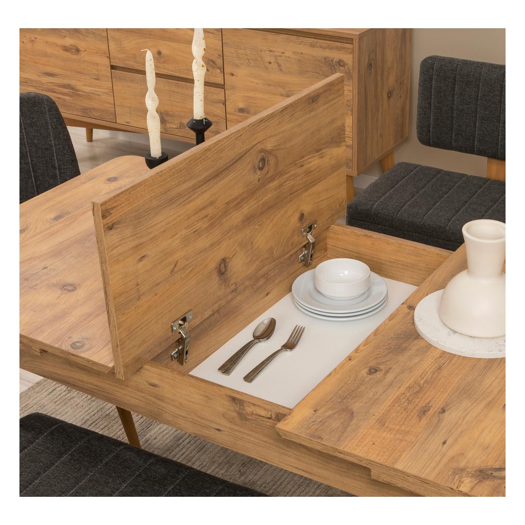 The dining table features a sleek Atlantic Pine finish that will complement any decor, while the Anthracite color of the chairs adds a modern touch to the set. The extendable feature of the table allows you to easily accommodate more guests when needed, making it ideal for both small and large gatherings. The set also includes a bench and a storage unit for added convenience and versatility.