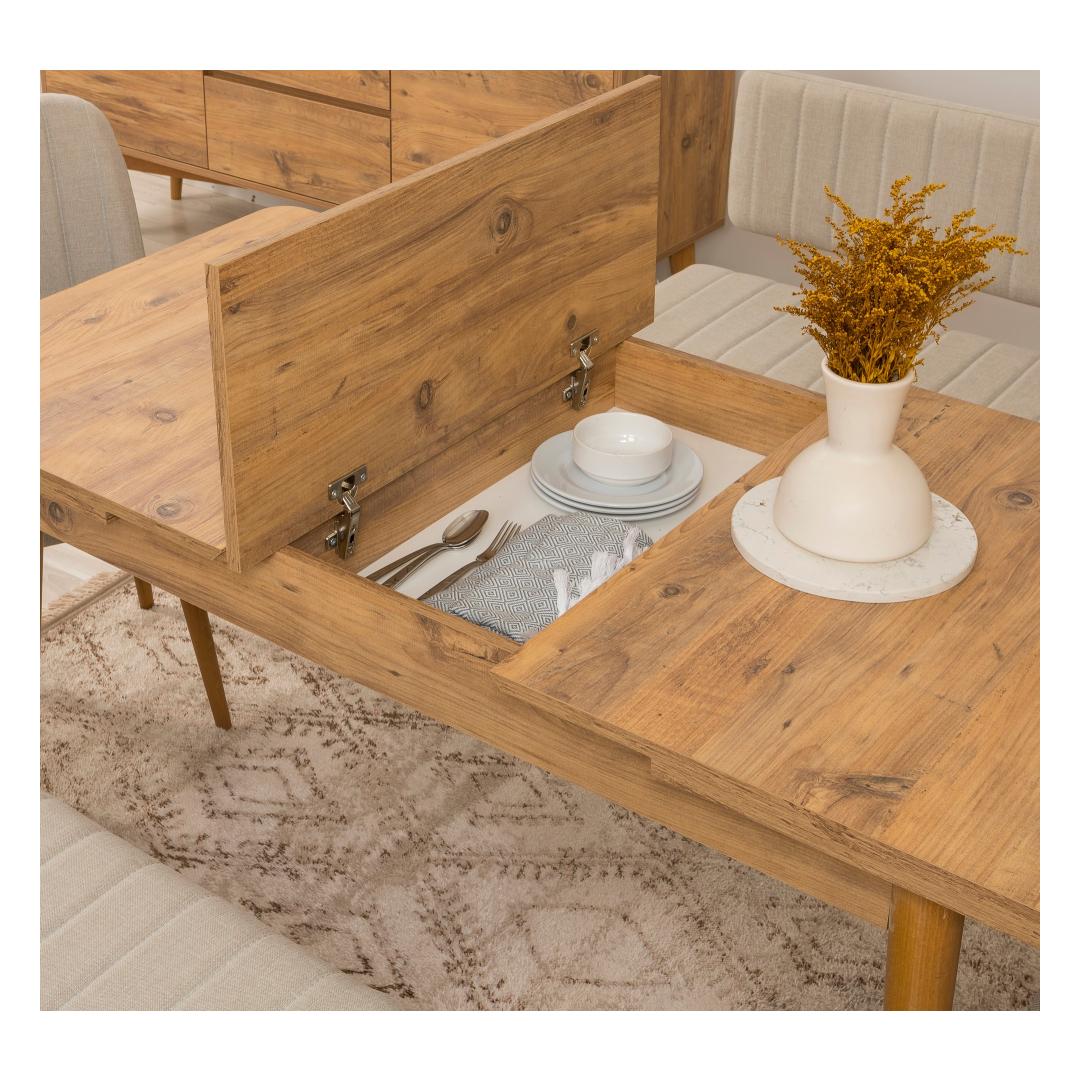 The dining table can be extended to accommodate more guests, making it perfect for family gatherings and dinner parties. The set includes 4 chairs and a bench, providing ample seating options for your guests. The storage unit adds convenience and practicality to the set.