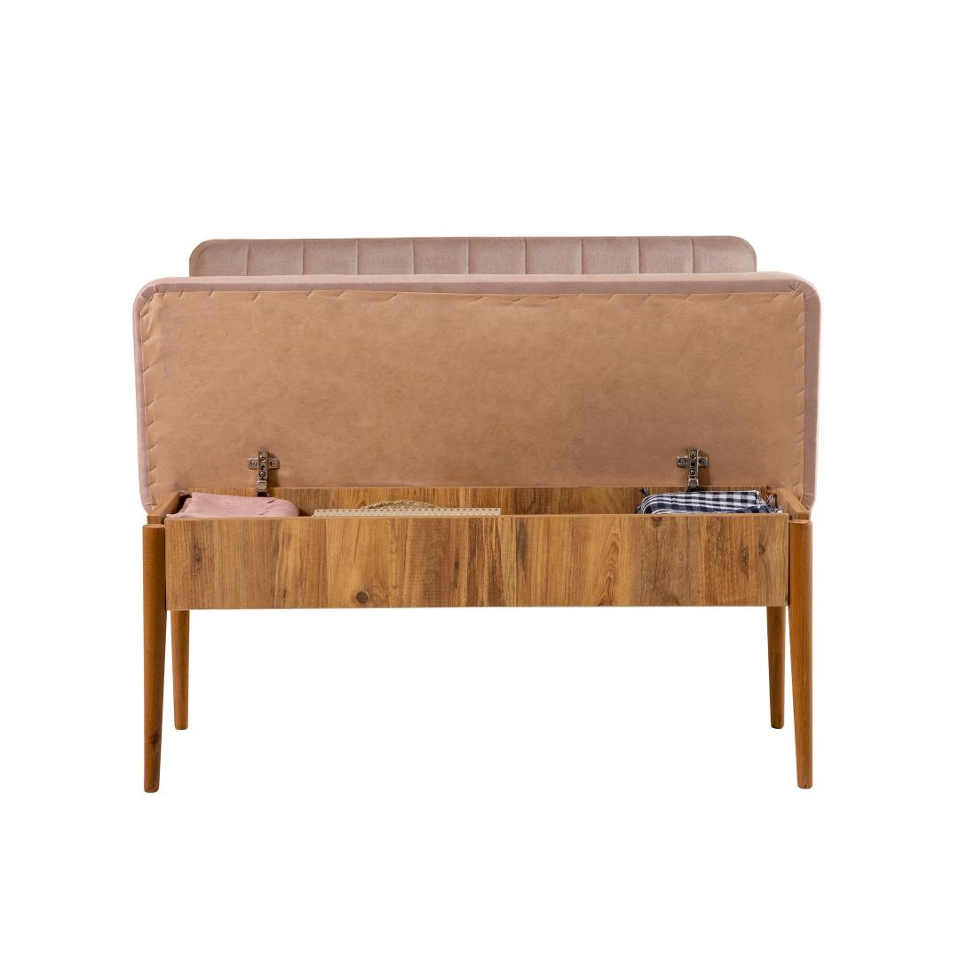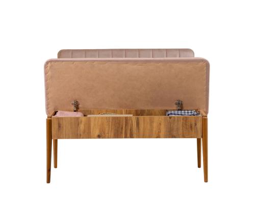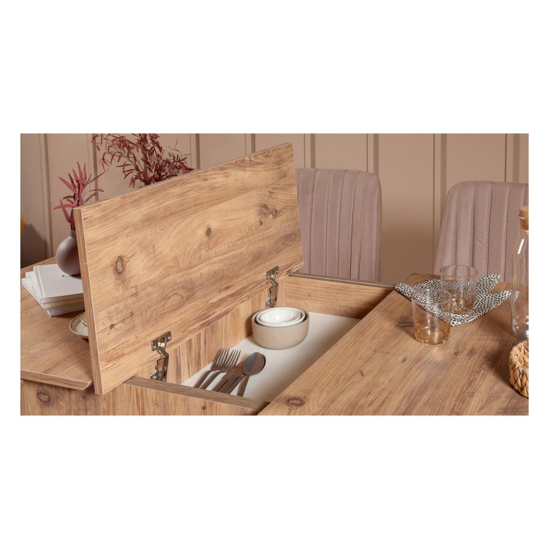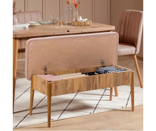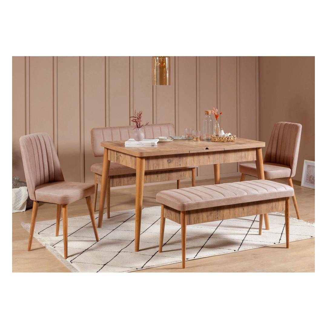 The extendable dining table easily accommodates guests with its open size of 165 cm, while the bench and storage unit provide additional seating and storage options. The chairs are designed for comfort with a seat height of 49 cm, perfect for long dinners and gatherings.