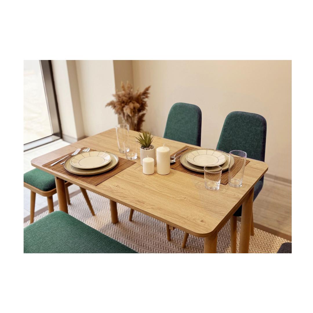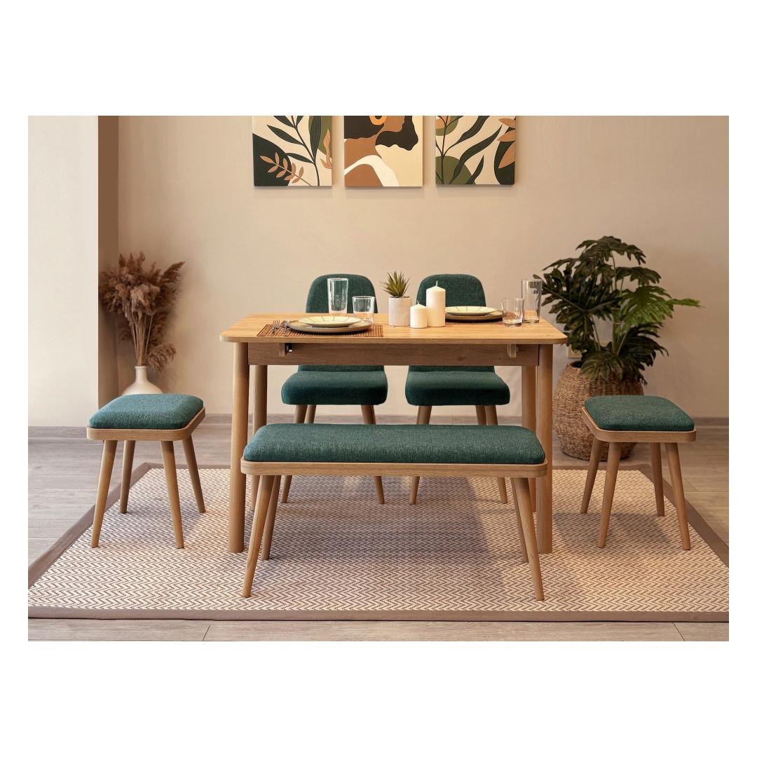 The dining table features a sleek and modern design, with a 100% melamine coated particle board construction that is both durable and easy to clean. The set includes four chairs, a stool, and a bench, all in a beautiful combination of Oak and Green colors that will complement any decor.
