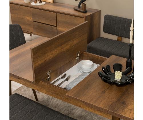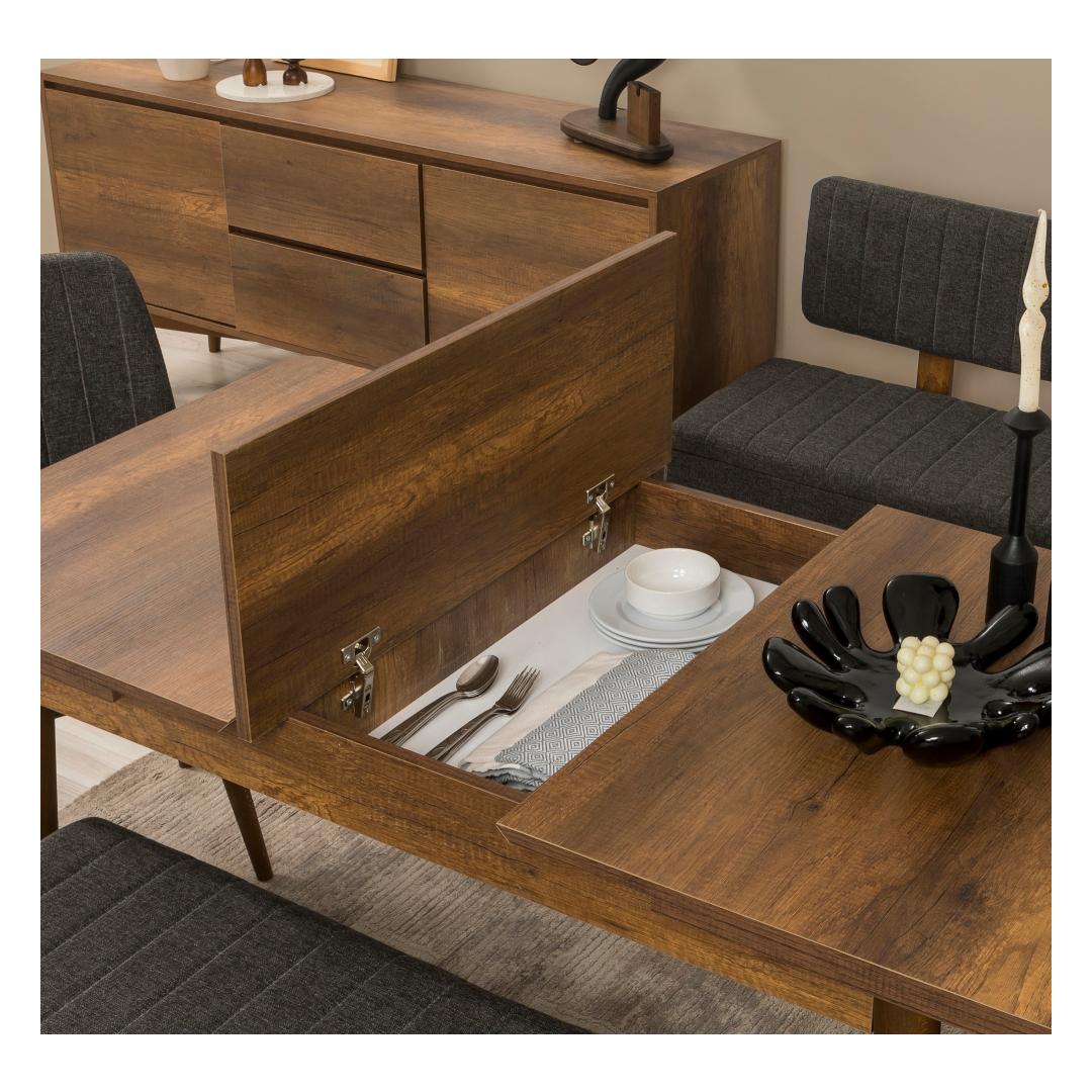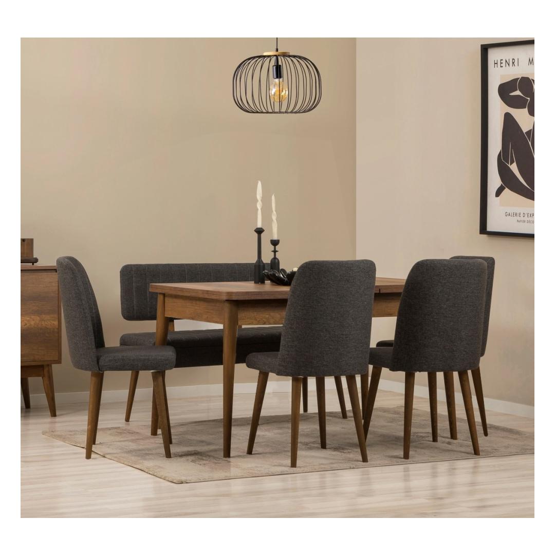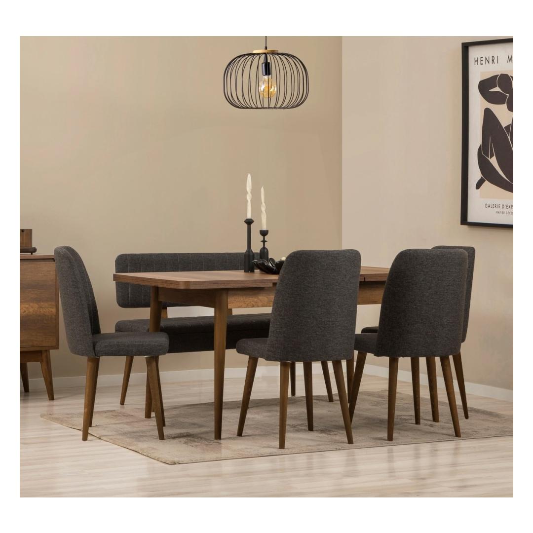 The dining table features a sleek walnut finish that complements any decor, while the anthracite chairs add a modern touch to the set. With an extendable table size of 165 cm, you can easily accommodate extra guests for dinner parties or family gatherings. The set also includes a bench and storage unit, providing additional seating and storage space for your dining essentials.