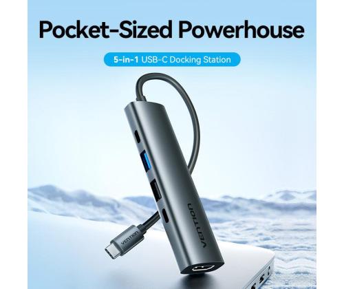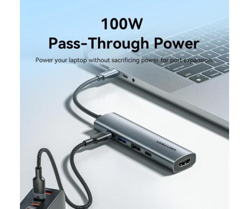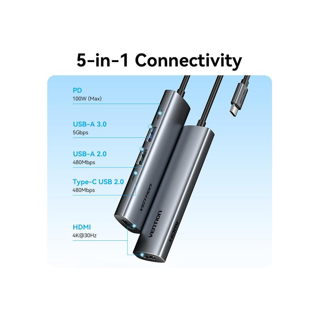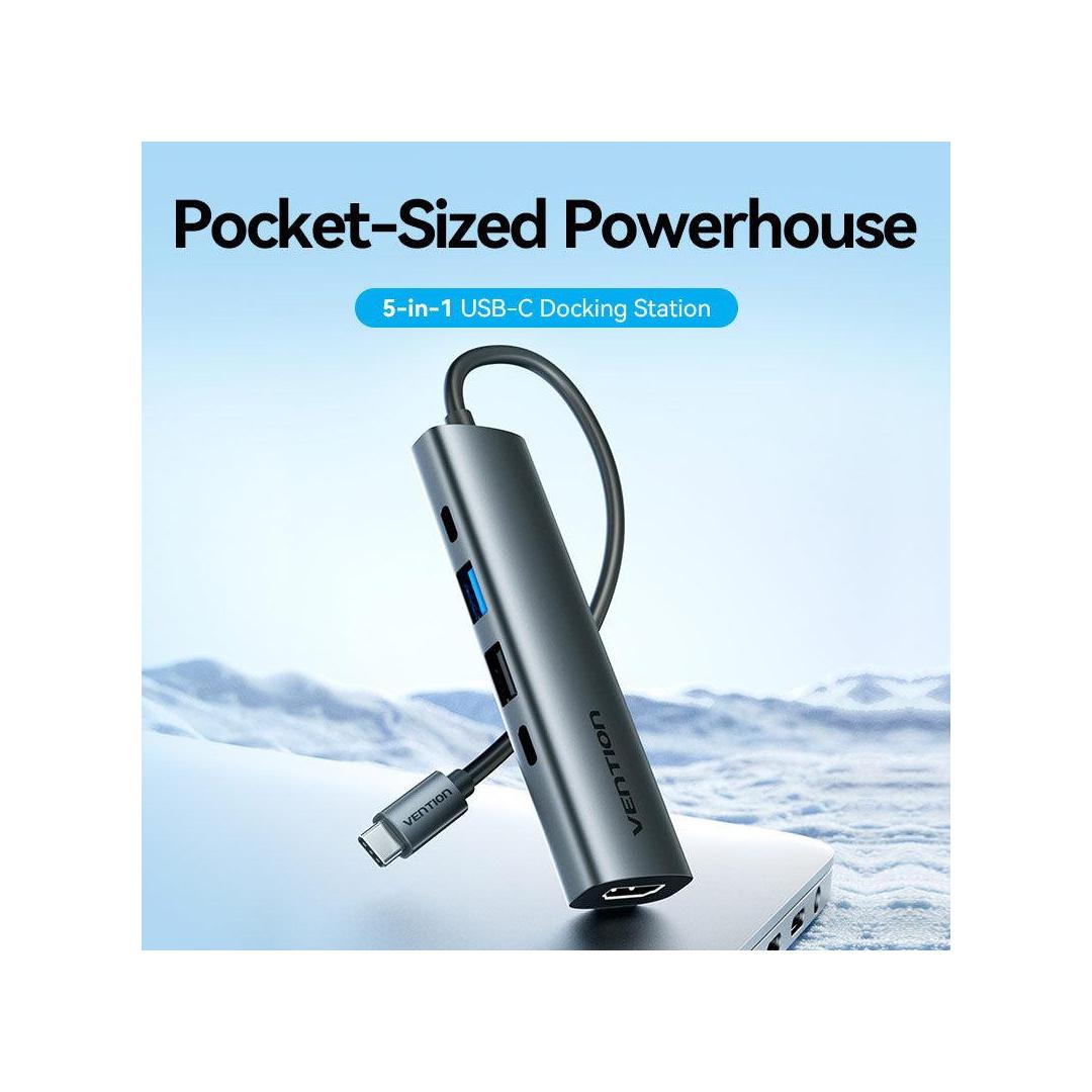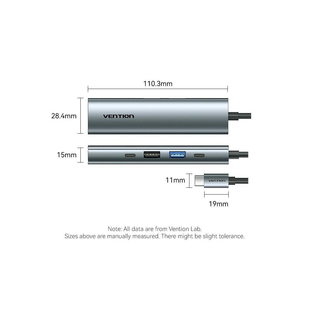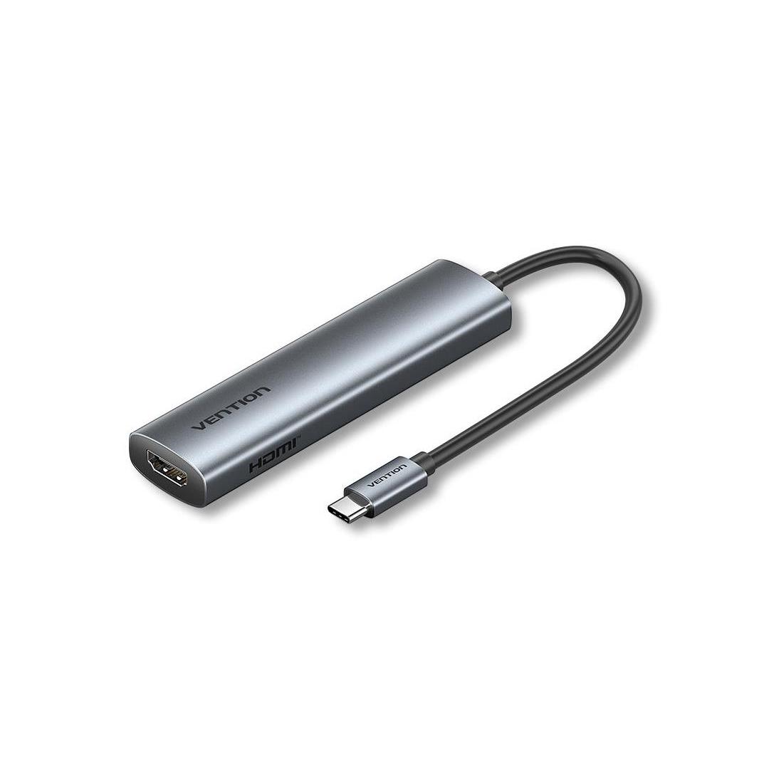 Vention USB-C to HDMI + USB 3.0 + USB 2.0 + USB 2.0 Type-C + PD Docking Station. Connectivity technology: Wired, Host interface: USB 3.2 Gen 1 (3.1 Gen 1) Type-C, USB Power Delivery up to: 100 W. Product colour: Grey, HD type: 4K Ultra HD, Hub interfaces: HDMI, USB 2.0, USB 3.0, USB Type-C. Power supply type: USB. Other operating systems supported: Android, iOS, iPadOS. Width: 28.4 mm, Depth: 110.3 mm, Height: 15 mm