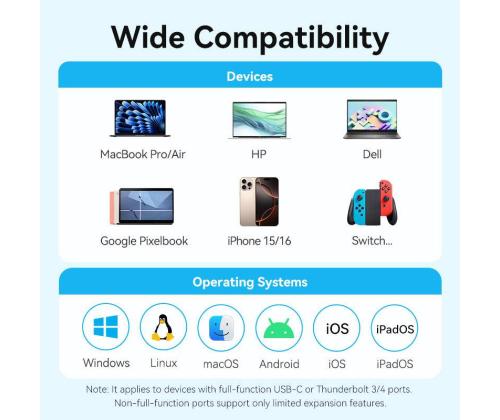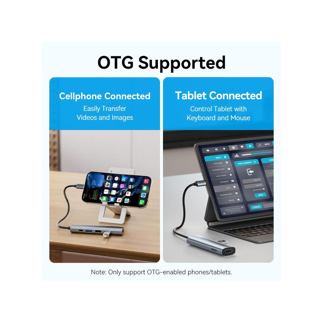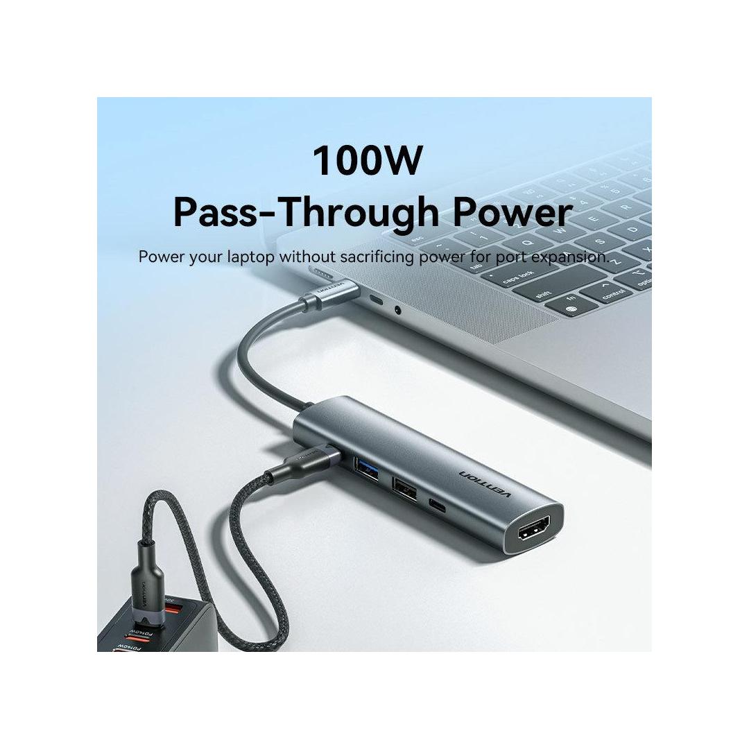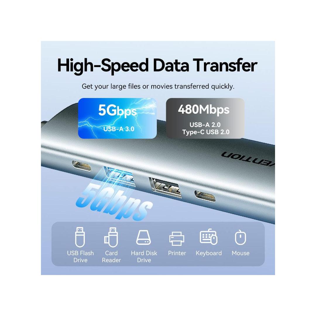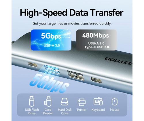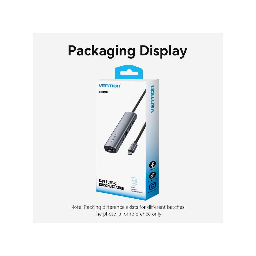 Vention USB-C to HDMI + USB 3.0 + USB 2.0 + USB 2.0 Type-C + PD Docking Station. Connectivity technology: Wired, Host interface: USB 3.2 Gen 1 (3.1 Gen 1) Type-C, USB Power Delivery up to: 100 W. Product colour: Grey, HD type: 4K Ultra HD, Hub interfaces: HDMI, USB 2.0, USB 3.0, USB Type-C. Power supply type: USB. Other operating systems supported: Android, iOS, iPadOS. Width: 28.4 mm, Depth: 110.3 mm, Height: 15 mm