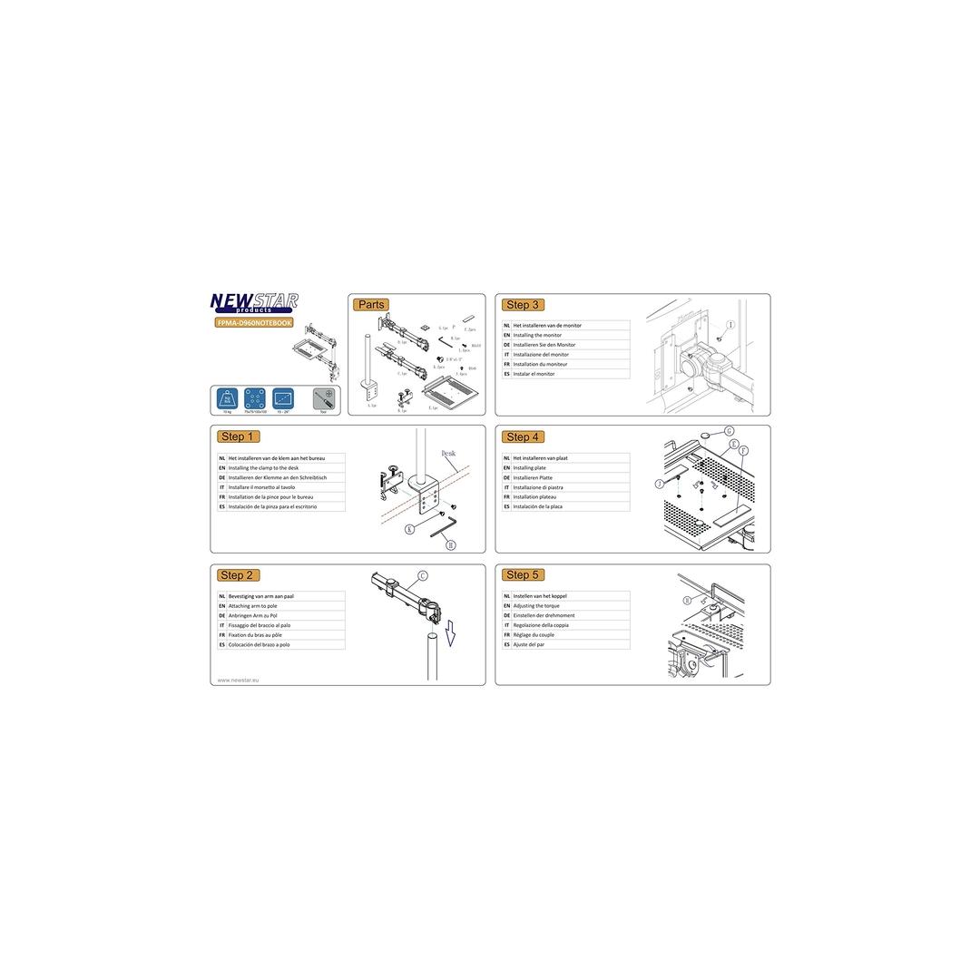 NewStar FPMA-D960NOTEBOOK -kiinnikkeessä on kolme kääntöpistettä ja se sopii enintään 26" (65 cm) näyttöihin. Tämän tuotteen painokapasiteetti on 10 kg kutakin näyttöä kohti ja 15 kg kutakin kannettavaa tietokonetta kohti. Pöytäkiinnike sopii näytöille, jotka täyttävät VESA-reikäkuvion 75x75 tai 100x100 mm. Eri reikäkuviot voidaan kattaa NewStar VESA -sovitinlevyillä.