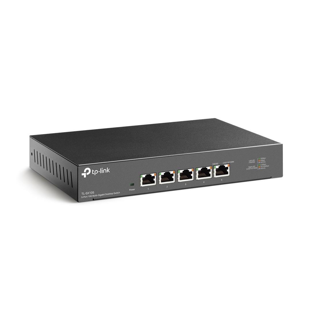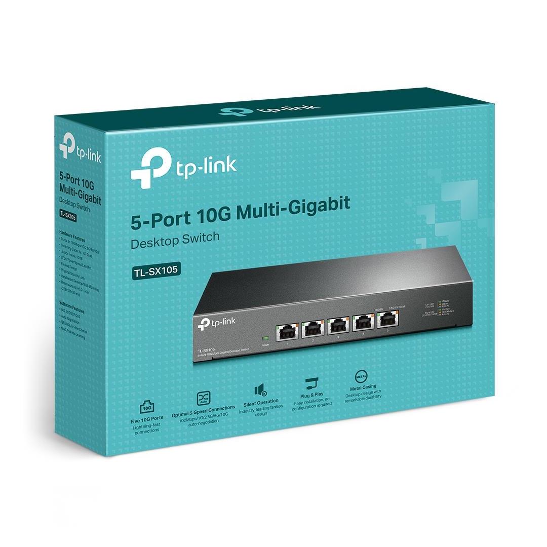Mukana toimitettavat lisävarusteet - 5-Port 10G Multi-Gigabit Desktop/Rackmount-kytkin TL-SX105- Virtajohto- Asennusopas- Kumijalat, mitat 226×131×35 mm
