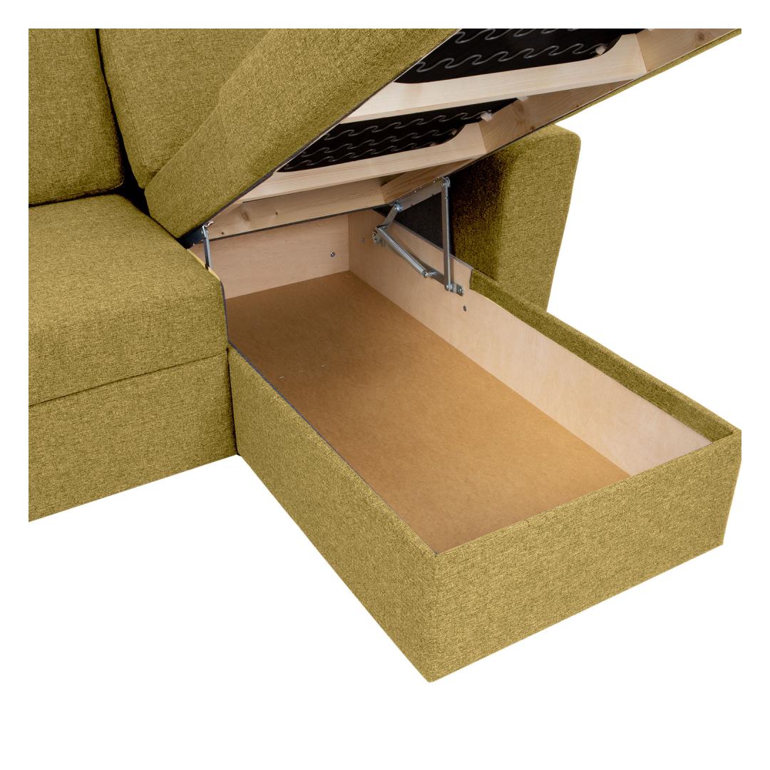 Sohvan kulmaosan alla on suuri pyykkilokero.