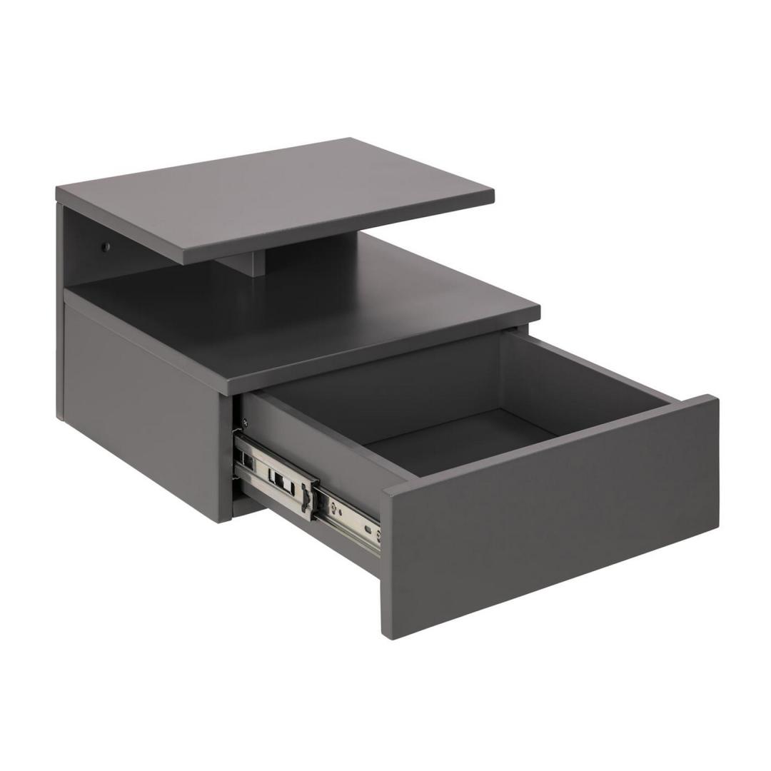 Yöpöytäkaappi ASHLAN 35x32xH22,5cm, hyllyllä ja laatikolla, seinäasennus, materiaali: puu, väri: vaaleanharmaa, viimeistely: lakattu. Seinään kiinnitettävä, valmistettu MDF-levystä, laatikko metallisaranoilla.