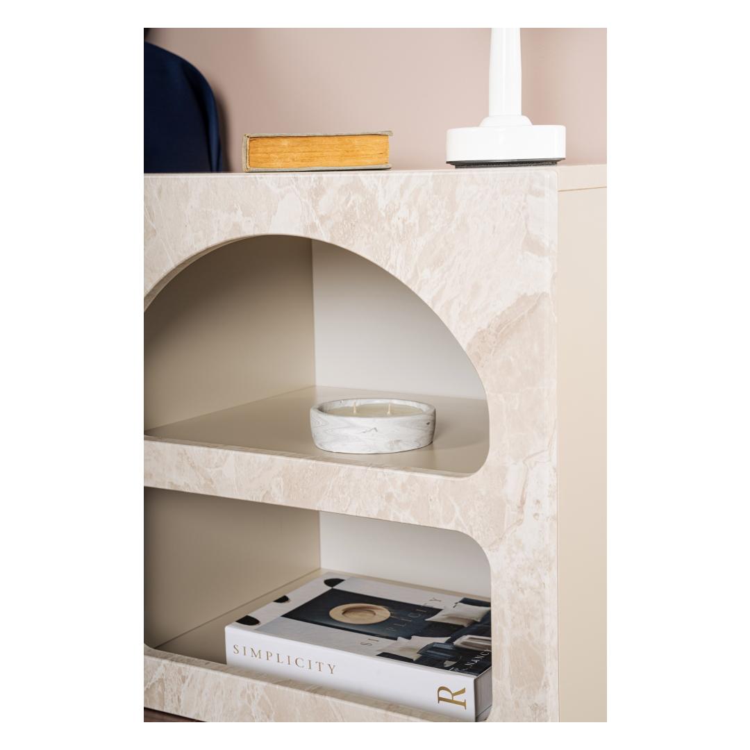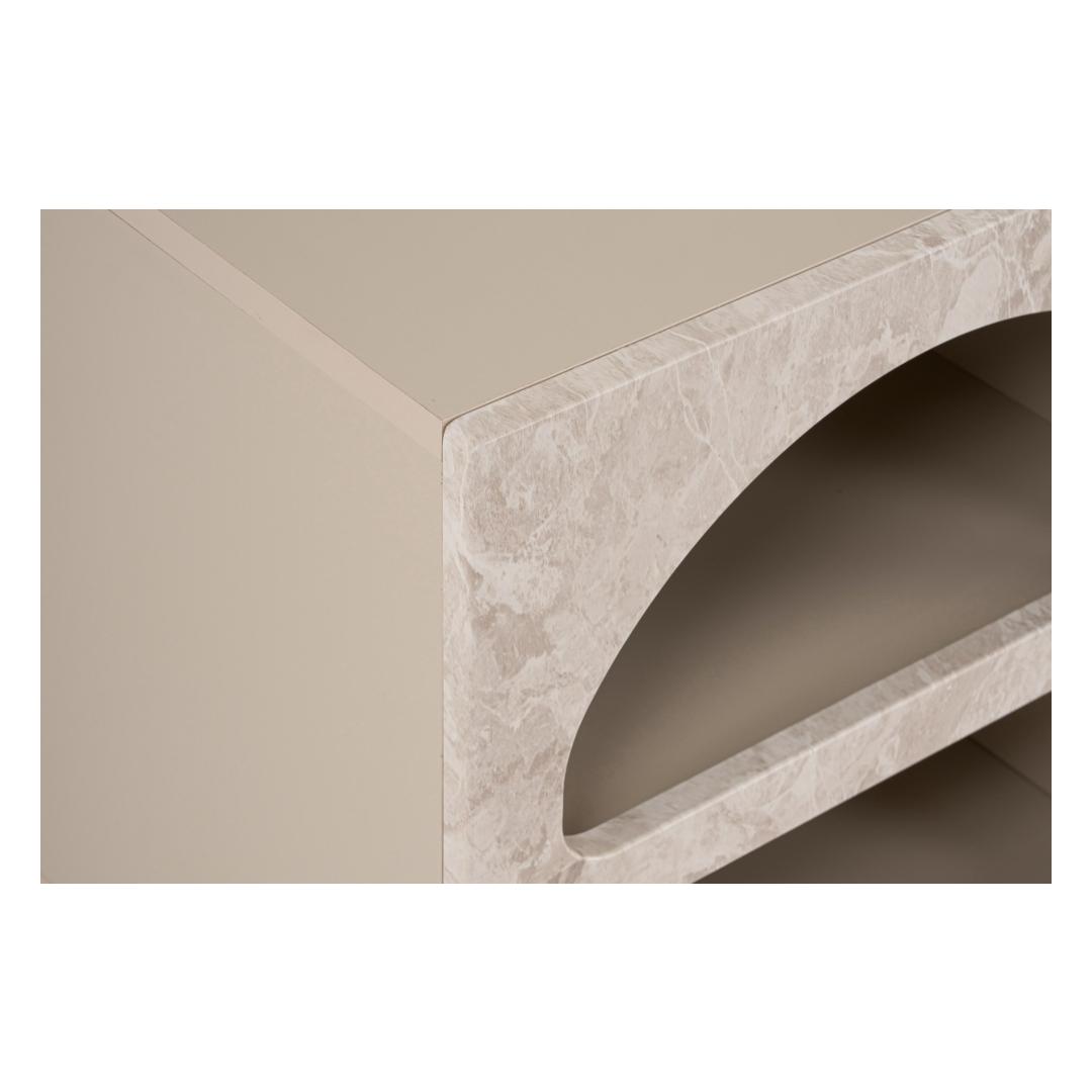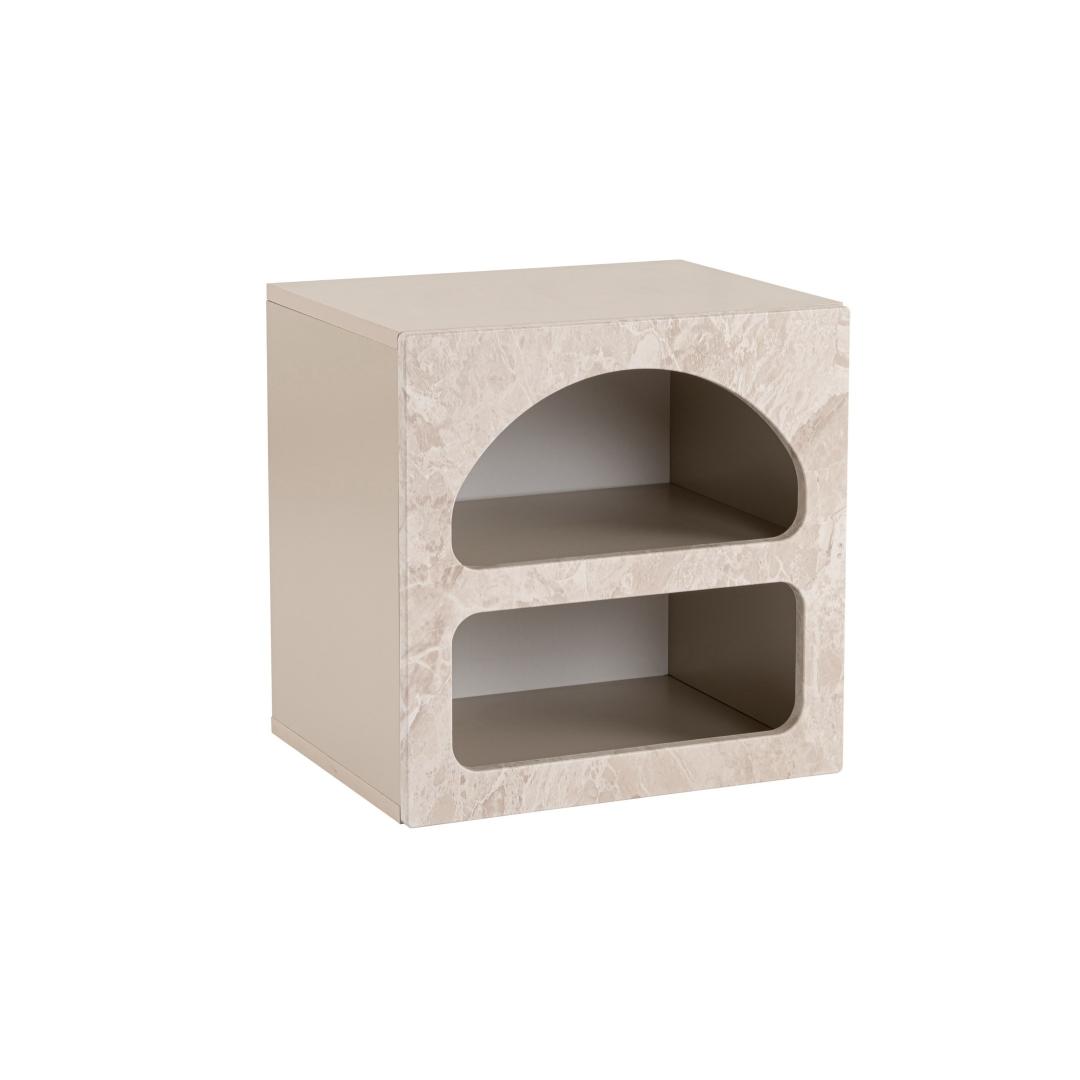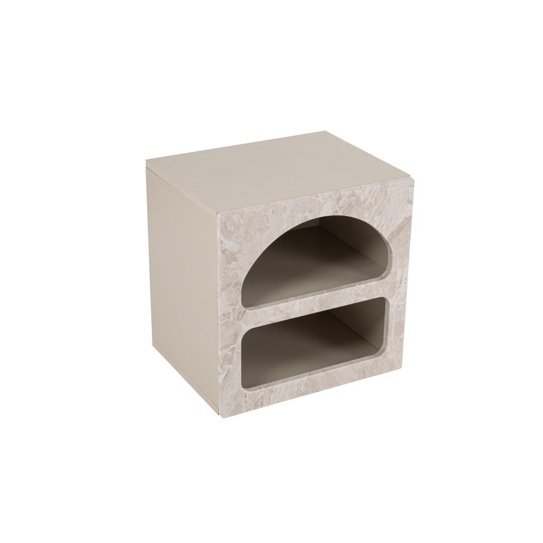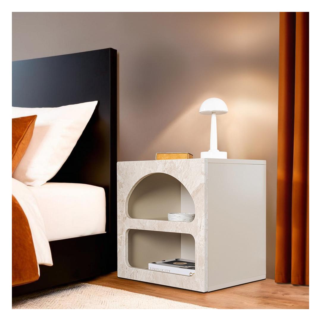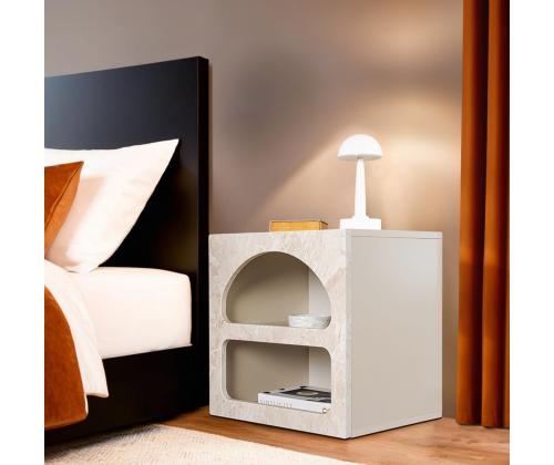 The Traverten Marble Nightstand is crafted from 100% melamine coated particle board, ensuring durability and longevity. The sleek marble finish in a beautiful sandstone color adds a luxurious touch to the piece, making it a standout feature in any room.