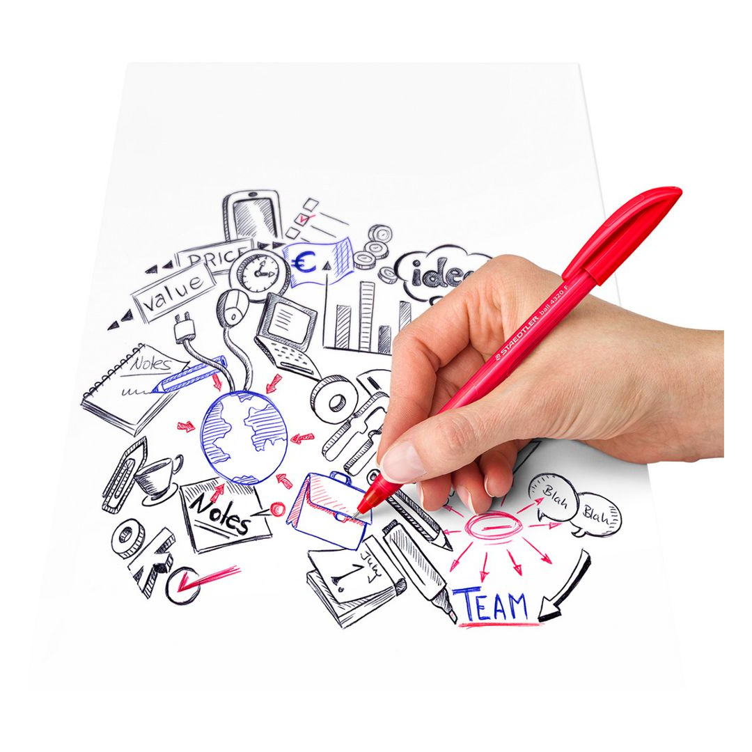 Staedtler Stick 432 -kynissä on pitkäkestoinen ja nopeasti kuivuva muste, joka tekee niistä ihanteellisia kaikissa työympäristöissä. Ergonominen kolmiomainen tynnyri takaa mukavan kirjoittamisen ja muste valuu erityisen tasaisesti. Jokaisessa kynässä on korkki ja klipsi, jotka estävät musteen kuivumisen ja mahdollistavat kynän ottamisen mukaan.