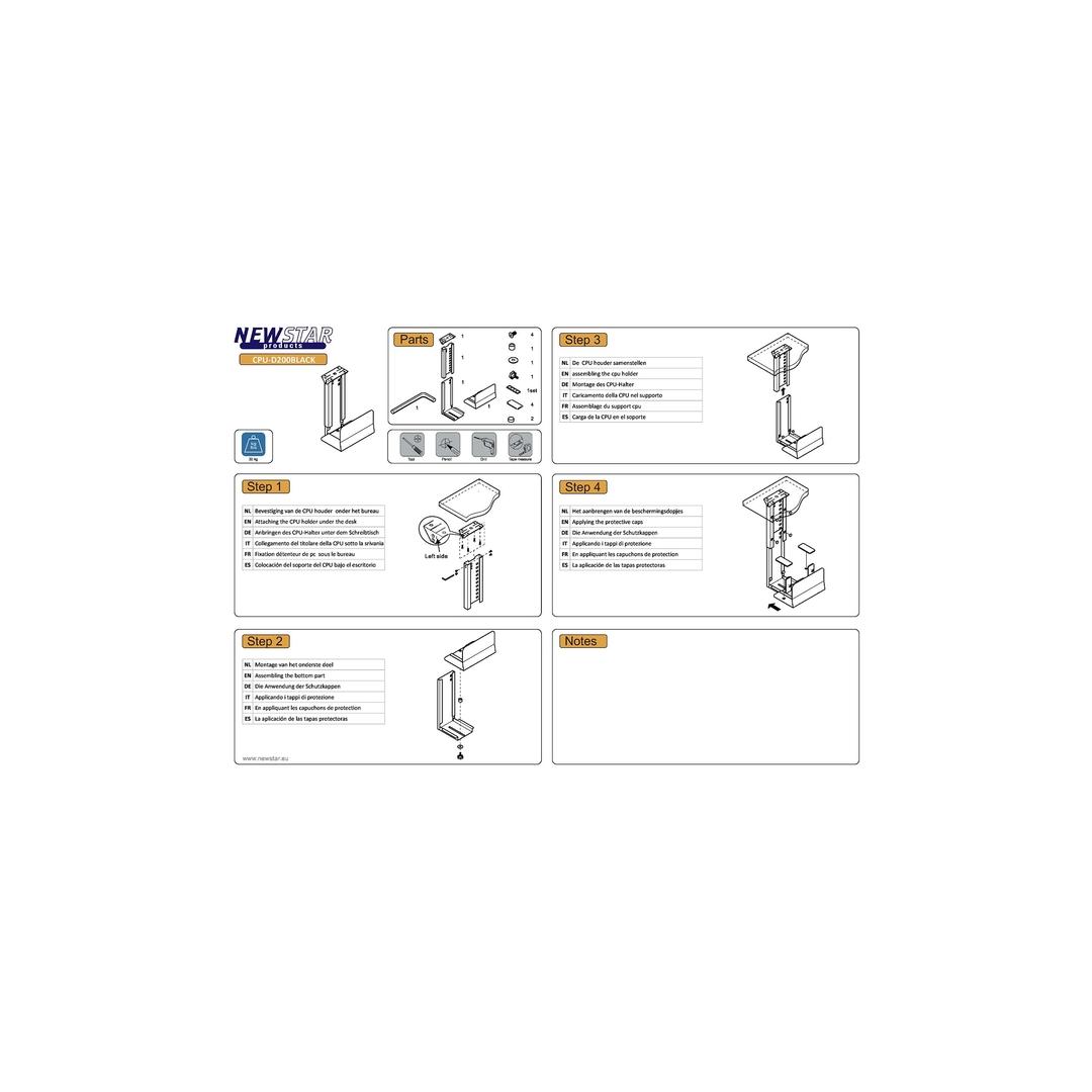 Paino 4 kg This NewStar CPU mount, model CPU-D200BLACK, allows you to mount a computer under a desk. A CPU mount creates a need and clean desk because its stored under the desk and doesn’t use any valuable desk space. Increase the lifetime of your CPU due to reduction intake dust and dirt from floors. Keep the workplace clean without computers on the floor.