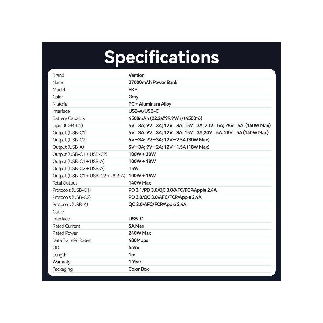 POWER BANK USB 27000MAH 140W/FKEH0 VENTION