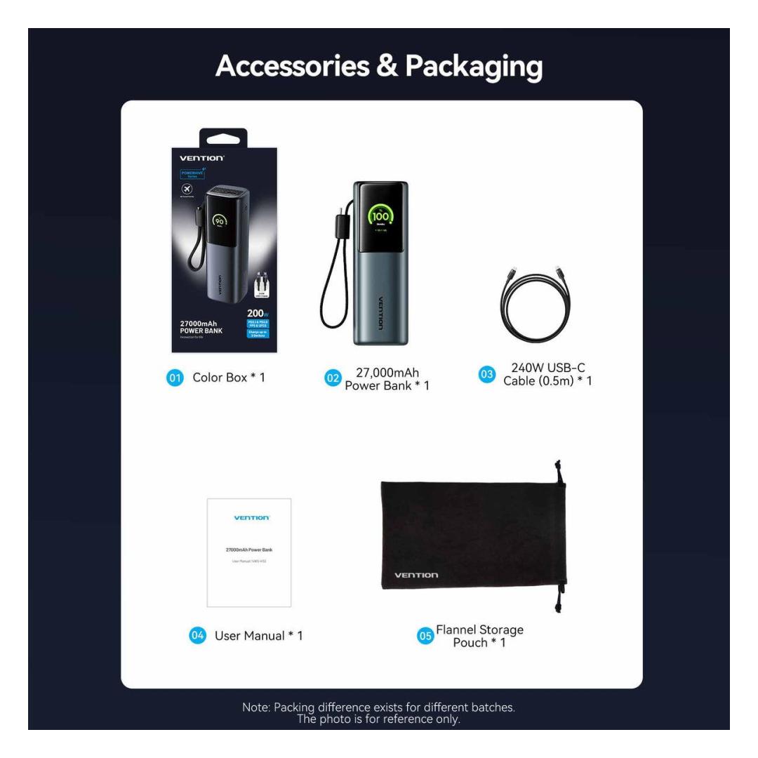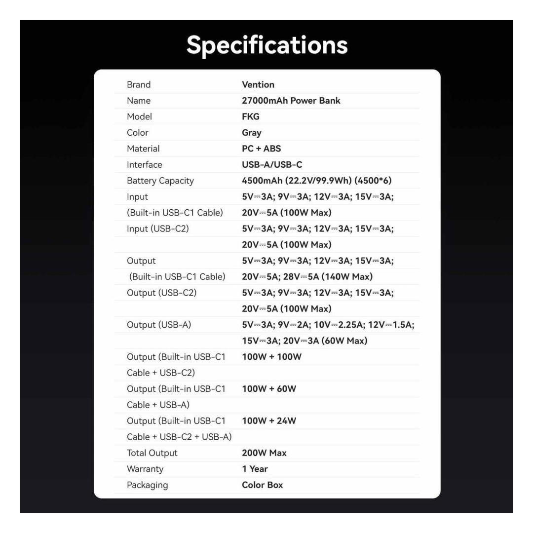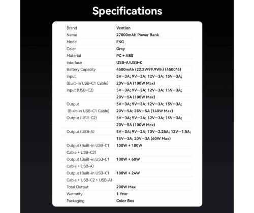 POWER BANK USB 27000MAH 200W/FKGH0 VENTION
