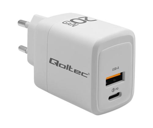 QOLTEC 51823 GaN 20W charger 5/20V 1.5/3A 1 x USB C PD 1x USB QC 3.0 White QOLTEC 51823 GaN 20W charger 5/20V 1.5/3A 1 x USB C PD 1x USB QC 3.0 White