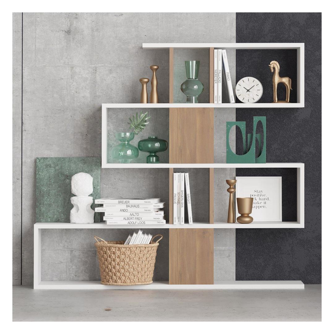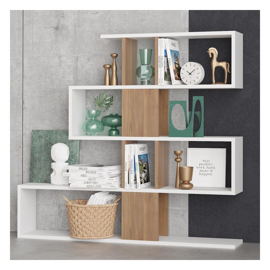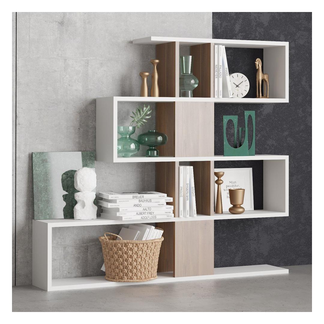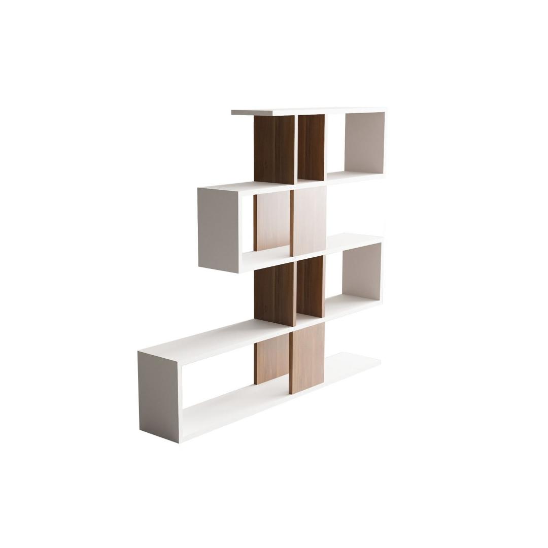 The bookshelf is designed with a beautiful combination of white and walnut colors, creating a visually pleasing contrast that adds a touch of elegance to any room.