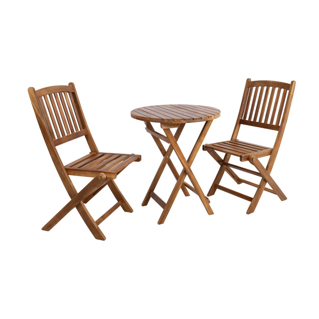 Pöytä ja tuolit on valmistettu akaasiapuusta ja viimeistelty puunsuojaöljyllä.