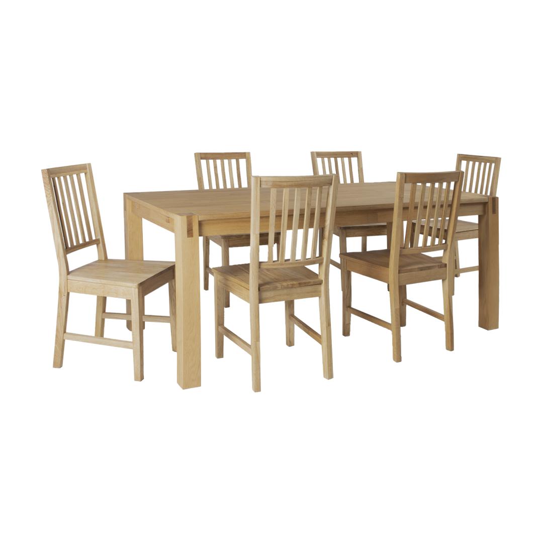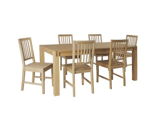 Ruokailusetti CHICAGO NEW pöytä ja 6 tuolia. Pöydän mitat 180x90xH76cm. Pöytälevy: MDF-levy, jossa on luonnollista tammiviilua. Pöydän jalat (8x8cm) ja runko massiivipuuta, jossa on luonnollista tammiviilua. Pöytä on viimeistelty puuöljyllä. Tuolin mitat ovat 43x42xH94cm. Tuoli on valmistettu massiivitammesta ja viimeistelty puuöljyllä. Painoraja 120kg. On mahdollista ostaa jatkopala 45x90cm koodilla 84026. Jatkopala voidaan asentaa pöydän molempiin päihin. HUOLTO: Pöytälevy, jossa on luonnonviilua, on hyvin herkkä kosteusvaurioille ja lämpötilalle. Pöytä on erittäin herkkä kosteudelle ja kosteudelle. Käytä aina pöydän alla alusmattoja ja keittolevyjä. Kaikki pöydälle valuneet nesteet on pyyhittävä välittömästi pois pehmeällä liinalla. Vältä liiallista hankausta ja hankaavia puhdistusaineita. Ruokailusetti CHICAGO NEW pöytä ja 6 tuolia. Pöydän mitat 180x90xH76cm. Pöytälevy: MDF-levy, jossa on luonnollista tammiviilua. Pöydän jalat (8x8cm) ja runko massiivipuuta, jossa on luonnollista tammiviilua. Pöytä on viimeistelty puuöljyllä. Tuolin mitat ovat 43x42xH94cm. Tuoli on valmistettu massiivitammesta ja viimeistelty puuöljyllä. Painoraja 120kg. On mahdollista ostaa jatkopala 45x90cm koodilla 84026. Jatkopala voidaan asentaa pöydän molempiin päihin. HUOLTO: Pöytälevy, jossa on luonnonviilua, on hyvin herkkä kosteusvaurioille ja lämpötilalle. Pöytä on erittäin herkkä kosteudelle ja kosteudelle. Käytä aina pöydän alla alusmattoja ja keittolevyjä. Kaikki pöydälle valuneet nesteet on pyyhittävä välittömästi pois pehmeällä liinalla. Vältä liiallista hankausta ja hankaavia puhdistusaineita.