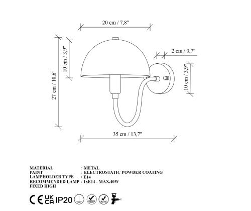 Valgustage oma ruumi kauni ja elegantse metallseina lambiga. See peen ese omab sujuvat metallkorpust ja katet, lisades igasse ruumi natuke rafineeritust. Elav oranž värv toob koheselt teie ruumi valgust ja loob sooja ning kutsuva atmosfääri.Parandage oma kodu sisustustLisage oma kodu sisustusele modernne puudutus selle kauni seinavalgustiga. Olgu see teie elutoas, magamistoas või koridoris, see lamp tõstab vaevata iga ruumi stiili. Unikaalne disain ja elav värv teevad sellest silmapaistva elemendi, mis kindlasti jätab teie külalistele mulje.Looge hubane atmosfäärMuuda oma ruum hubaseks ja kutsuvaks pühamuks selle seinalambi sooja kuma abil. Pehme, ümbritsev valgustus loob lõõgastava atmosfääri, mis on ideaalne pärast pikka päeva lõõgastumiseks. Olgu te lugemas raamatut või nautimas klaasi veini, see lamp pakub igaks juhuks ideaalset valgustust.Tehnilised andmed:Metallkorpus metallkattegaSuurus: 20 x 35 x 27 cmKatte suurus: Ø20 h:10 cmPõhja plaat: Ø10 h:2 cmPesatüüp: 1 x E 14 Max 40 WPirn ei ole kaasas220-240 VIP kood: IP20Värv: Oranž Värv: Orange