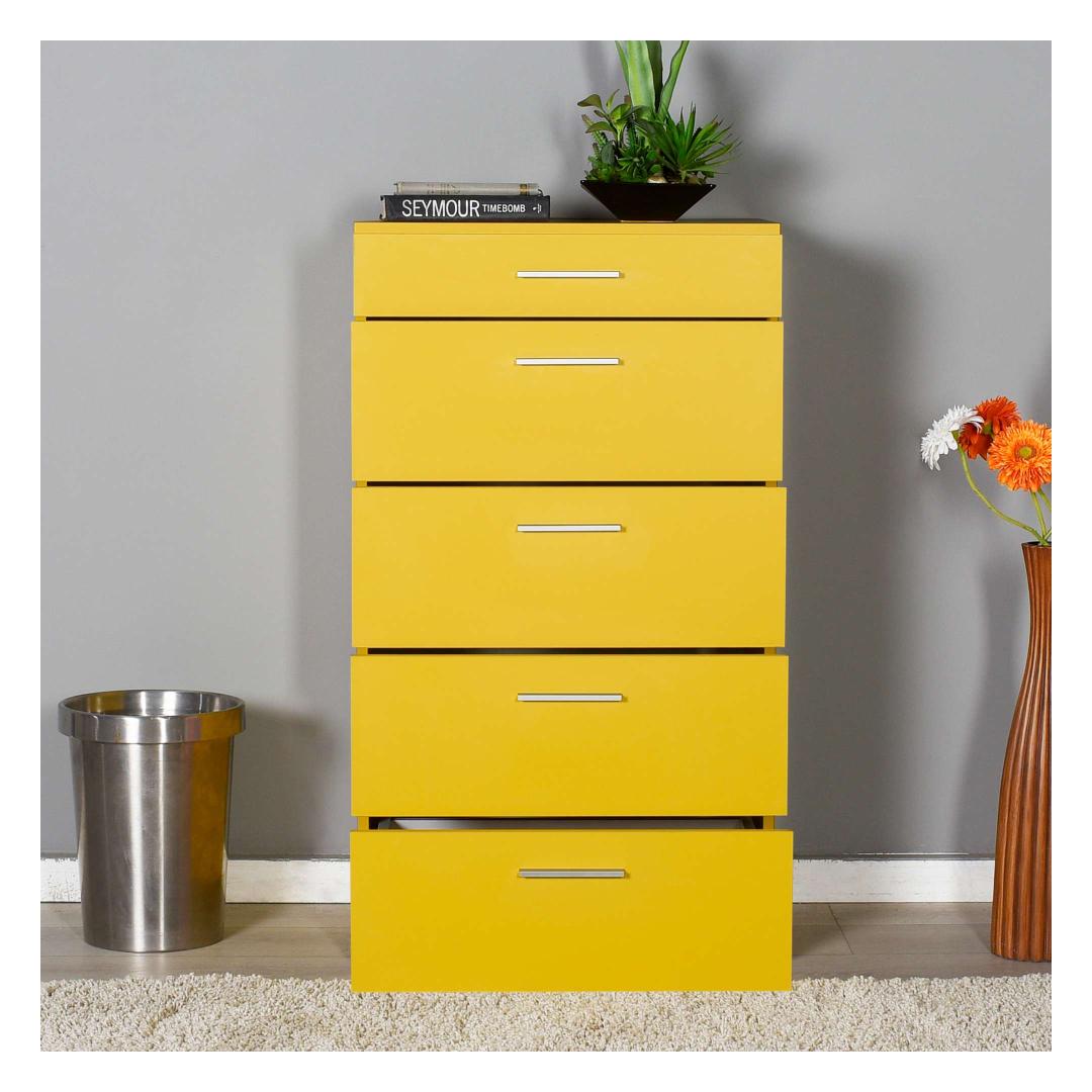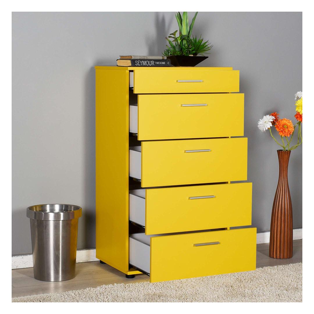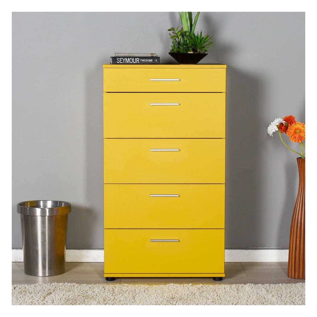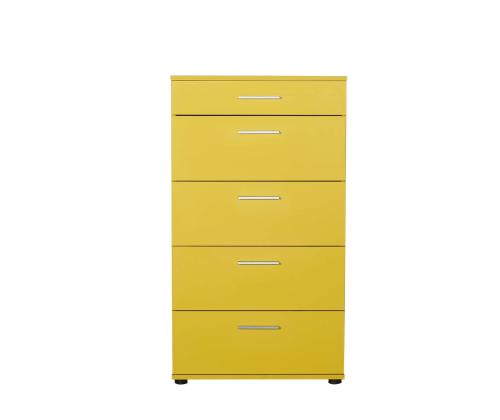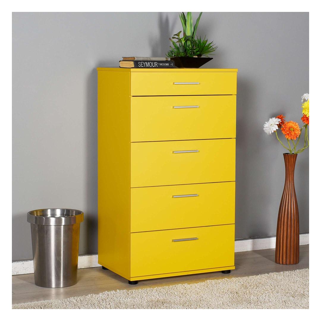 Muuda oma magamistuba selle hämmastava kollase kummutiga, mis kiirgab elegantsi ja rafineeritust. Elav värv toob koheselt valgust sinu ruumi ja lisab isikupära. Korralda Oma RuumiÜtle hüvasti segadusele ja tere korraldusele selle kummutiga. Viie avara sahtli ja arvukate riiulitega on sul piisavalt ruumi, et hoida kõik oma riided, aksessuaarid ja muud asjad. Hoia kõik korras ja puhas selle stiilse ja funktsionaalse mööbliesemega.Kvaliteetne EhitusValmistatud 100% melamiinkattega puitlaastplaadist, on see kummut loodud kestma. 16mm paksus tagab vastupidavuse ja stabiilsuse, samas kui sujuv disain lisab sinu magamistoa sisustusele modernset hõngu. Lihtne PaigaldadaSeda kummut saab kergesti seina külge kinnitada, et tagada lisaturvalisus. Järgige lihtsalt kaasasolevaid juhiseid, et paigaldamine oleks murevaba. Ära jäta kasutamata seda hädavajalikku eset oma magamistoas. Tellige nüüd ja kogege mugavust ja stiili, mida see kummut pakub.Tehnilised Andmed:Materjal: 100% melamiinkattega puitlaastplaatPaksus: 16mmLaius: 68cmKõrgus: 108cmSügavus: 44cmVärv: Kollane Värv: Yellow