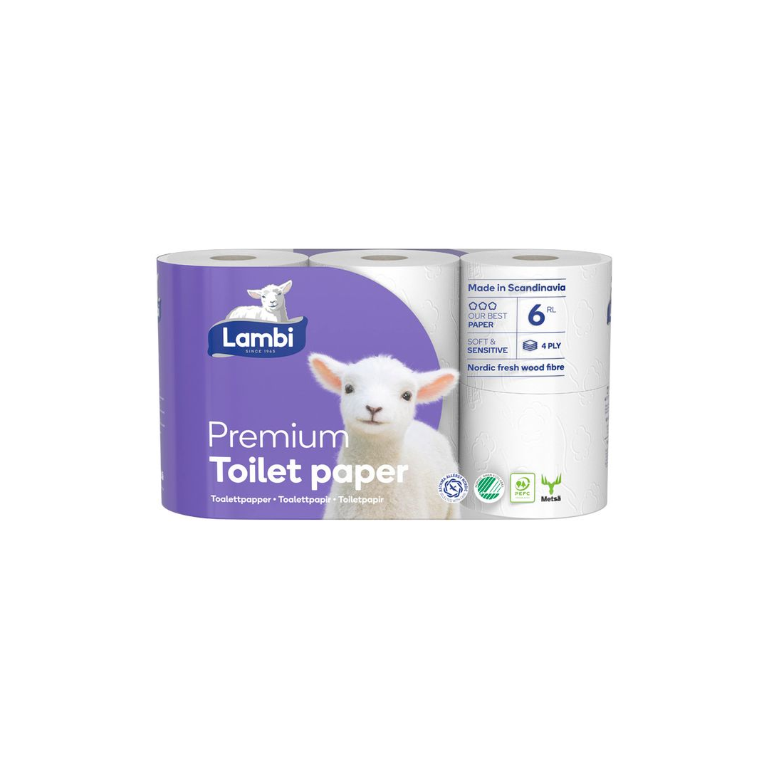 4-kertainen Lambi Premium -wc-paperi. Tuotteella on pohjoismainen sininen merkki. PEFC-sertifioitu. Valmistettu Ruotsissa.