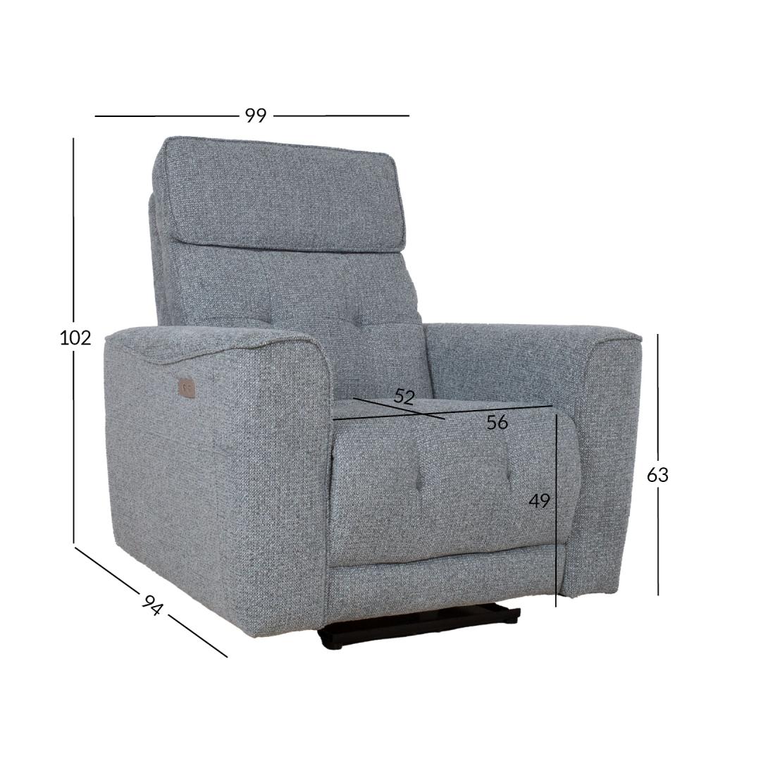 Nojatuolin kokonaismitat ovat 99x94xH102cm. Istuimen leveys 56cm, istuimen syvyys 52cm, istuimen korkeus 49cm. Käsinojan korkeus maasta 63cm. Nojatuoli BOSCO sähköinen lepotuoli, siniharmaa.