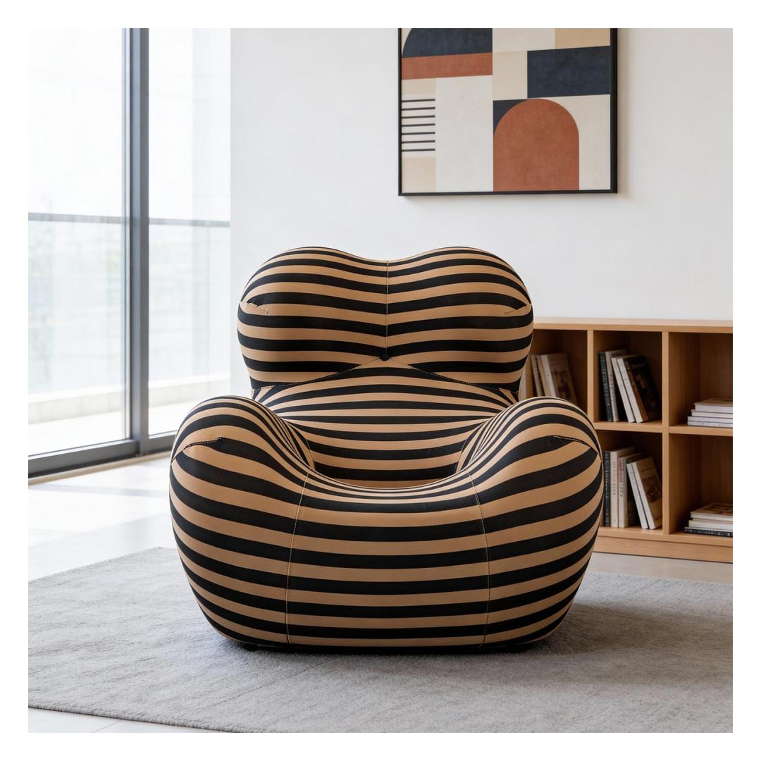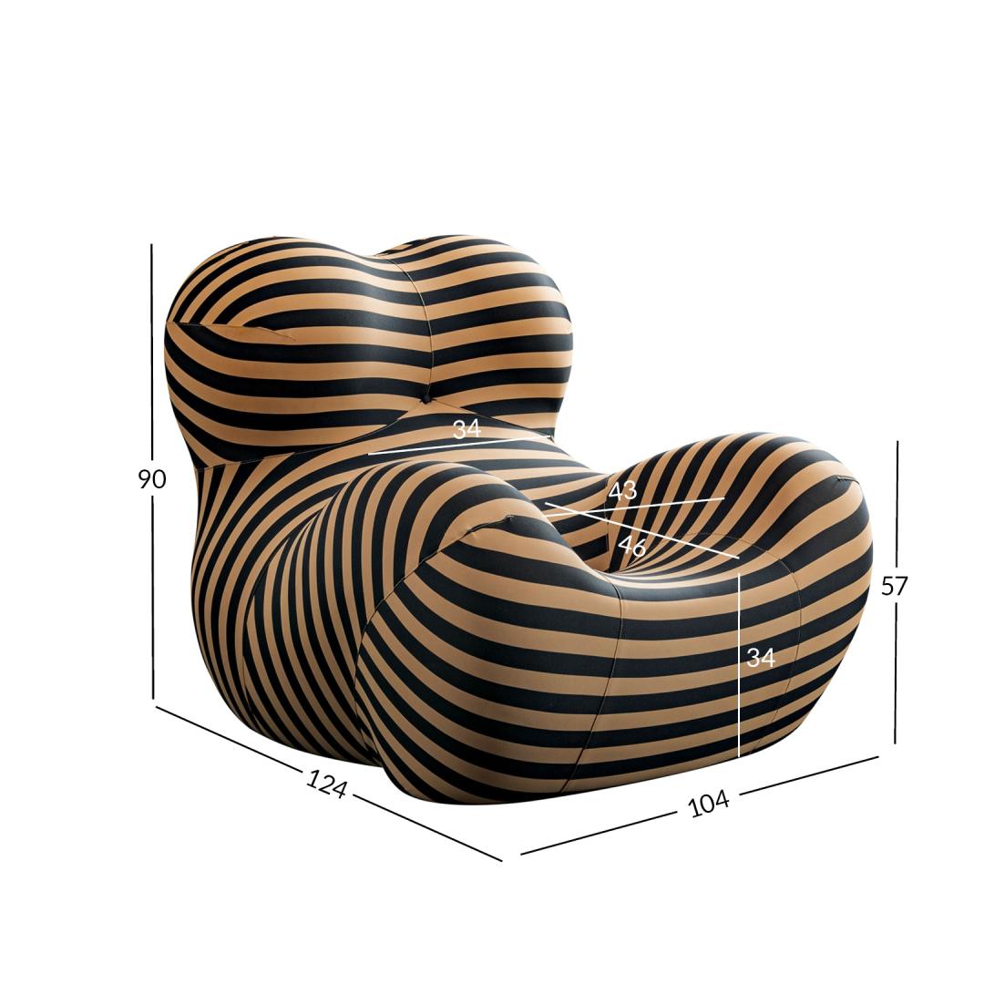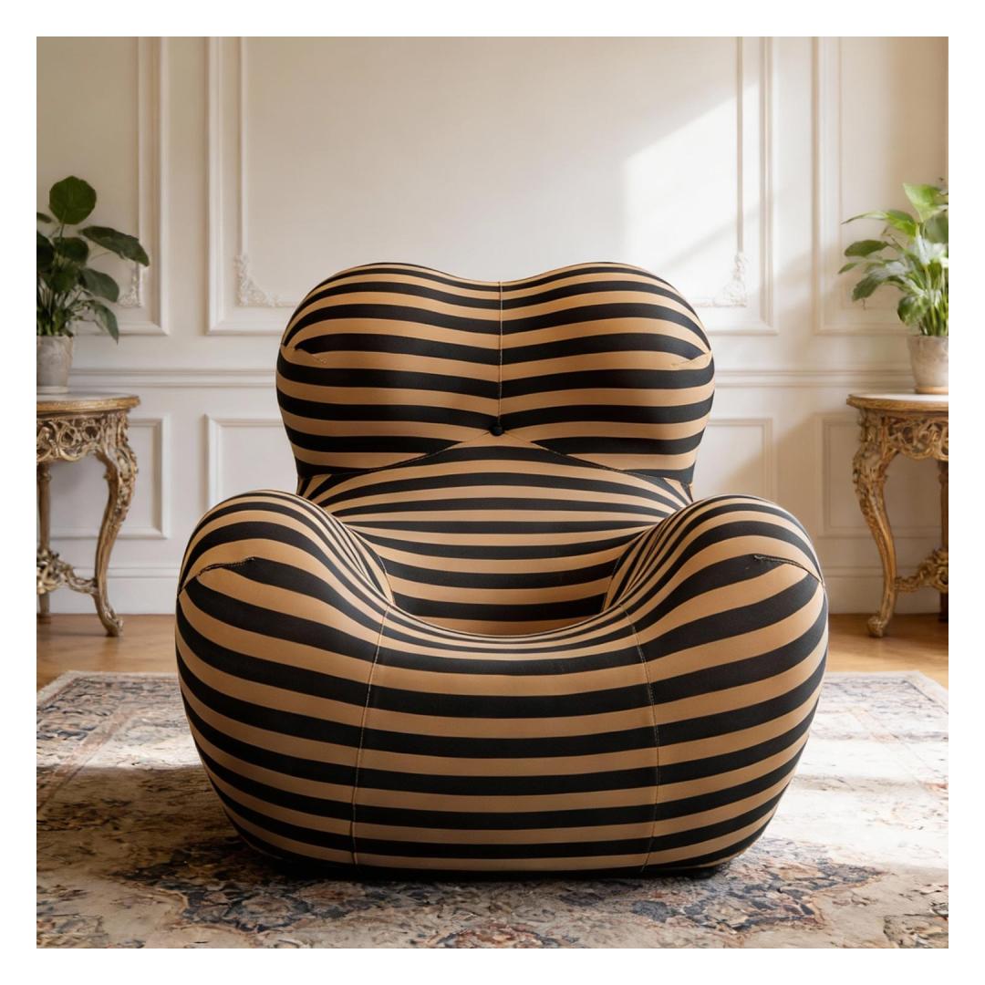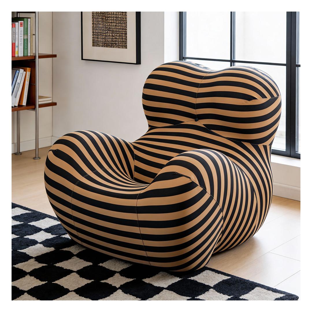 Tämä ainutlaatuisen muotoinen nojatuoli on todellinen katseenvangitsija missä tahansa huoneessa. Muotoilun pehmeät, orgaaniset linjat ja kontrastiraidallinen kangas luovat rohkean ja taiteellisen ilmeen, joka sopii täydellisesti moderniin, eklektiseen tai muotoilutietoiseen sisustukseen.