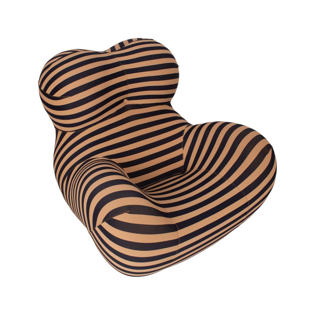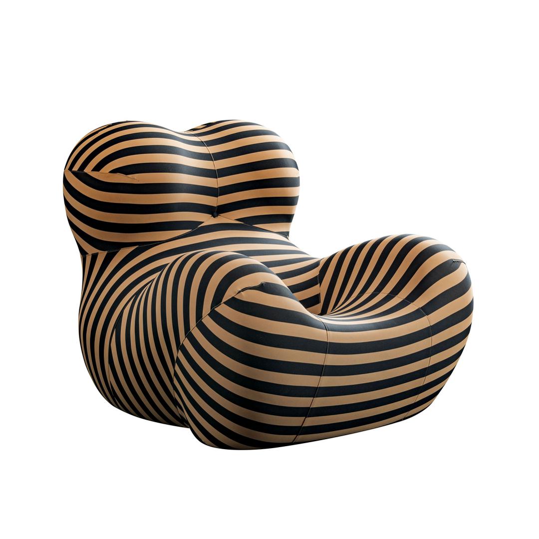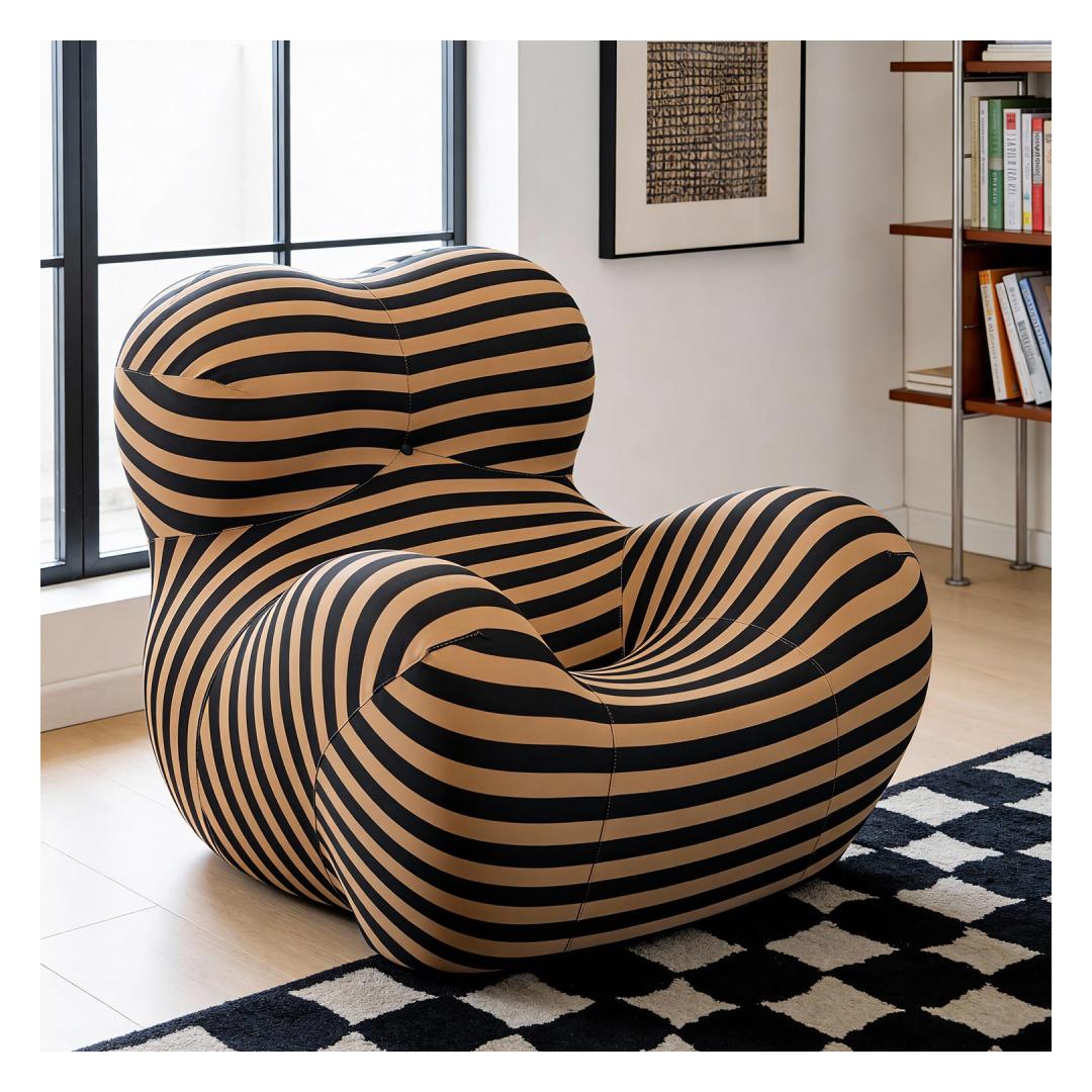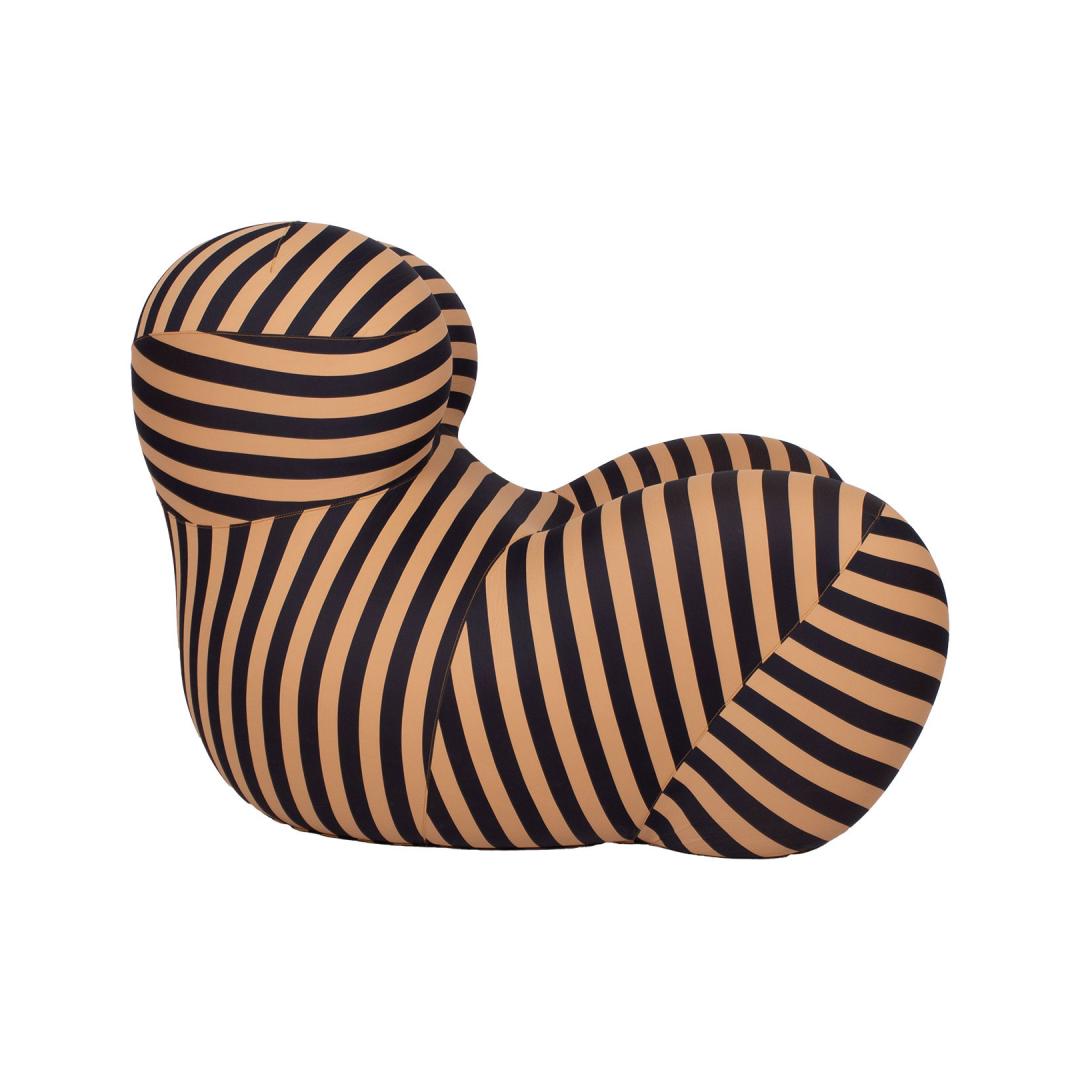 Tämä ainutlaatuisen muotoinen nojatuoli on todellinen katseenvangitsija missä tahansa huoneessa. Muotoilun pehmeät, orgaaniset linjat ja kontrastiraidallinen kangas luovat rohkean ja taiteellisen ilmeen, joka sopii täydellisesti moderniin, eklektiseen tai muotoilutietoiseen sisustukseen.