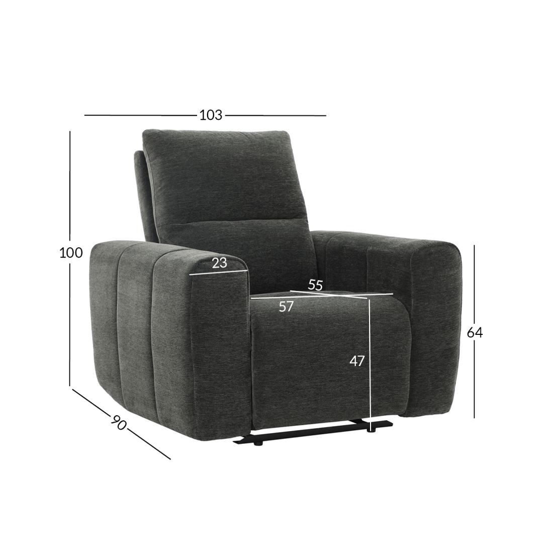 Nojatuolin kokonaismitat: 103x90xK100cm. Istuimen leveys 57cm, istuimen syvyys 55cm, istuimen korkeus 47cm. Käsinojan korkeus maasta 64cm, käsinojan leveys 23cm. Nojatuoli MATIAS sähköinen lepotuoli, harmaa.