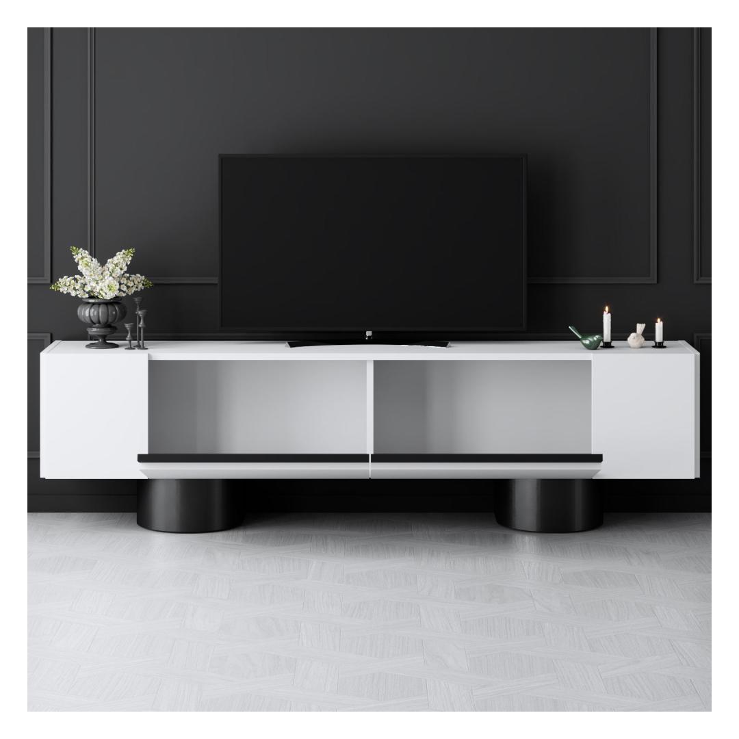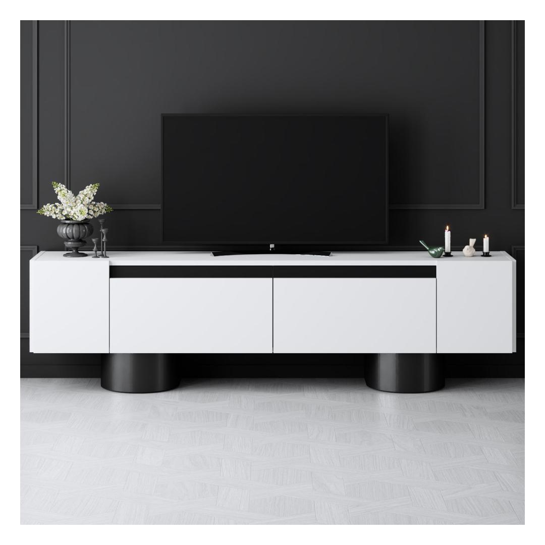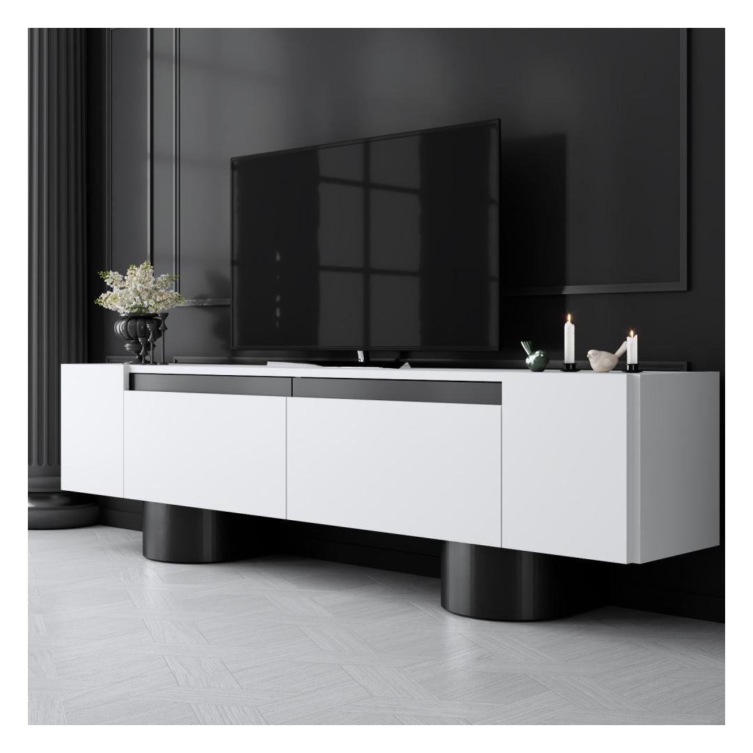 Transform your living room into a modern and stylish space with our sleek TV stand. Made from 100% melamine coated particle board, this stand is not only durable but also incredibly chic. The combination of white and black colors adds a contemporary touch to any room, making it the perfect addition to your home decor.
