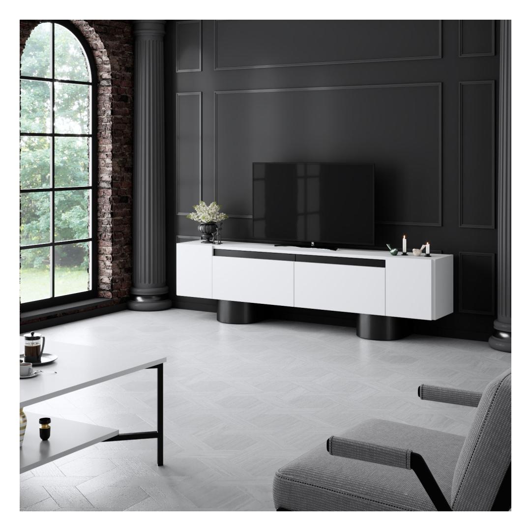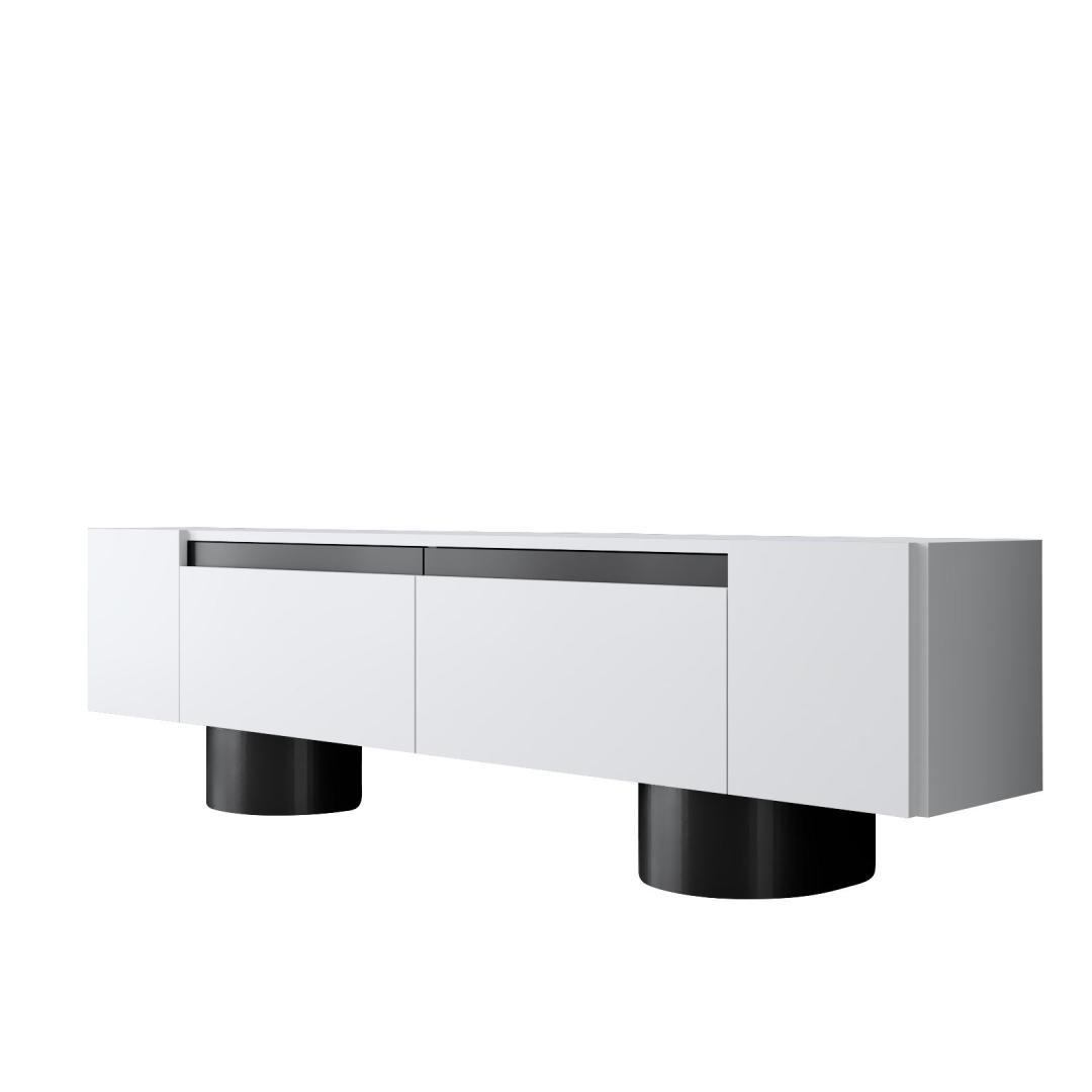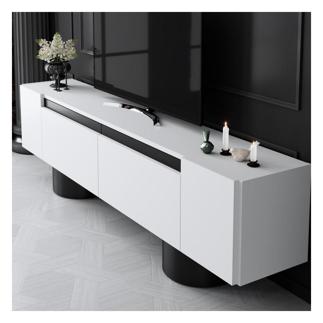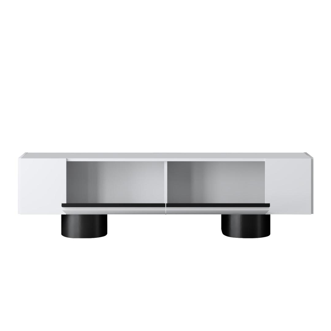 Transform your living room into a modern and stylish space with our sleek TV stand. Made from 100% melamine coated particle board, this stand is not only durable but also incredibly chic. The combination of white and black colors adds a contemporary touch to any room, making it the perfect addition to your home decor.